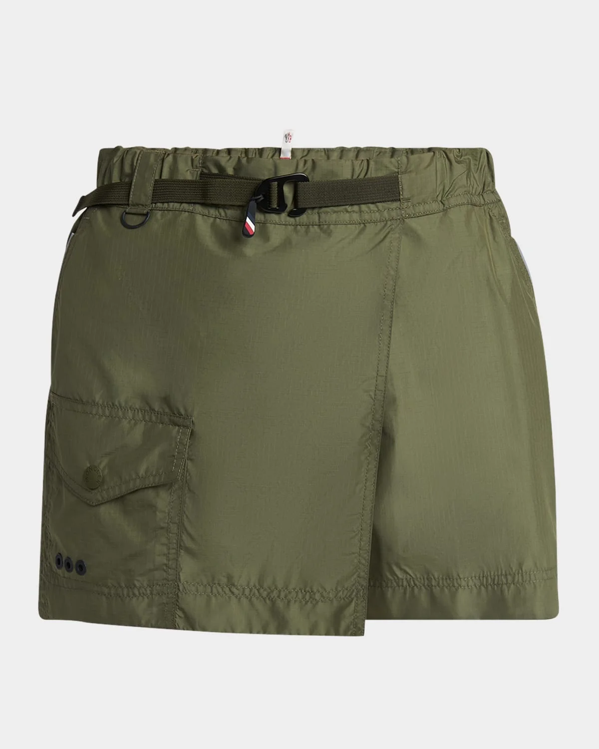 - Moncler parachute shorts featuring an adjustable elastic waistband and crossover front - Mid-rise; sits high on the hip - Side pockets - Front snap pocket - Relaxed fit - Pull-on style - Polyester - Unlined - Machine wash, dry flat - Imported