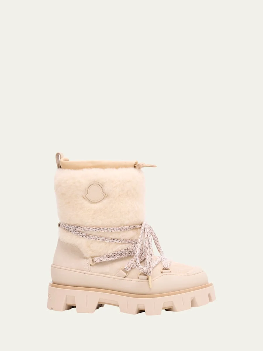 Defined by bold aesthetics and performance-driven details, the "Peak Apres" ankle boots from Moncler are crafted from suede with dyed long-haired lamb shearling (China) accents 1.75 in / 45 mm flatform heel Flat heel Round toe Wraparound lace-up vamp Adjustable drawcord at collar Pull-tab at backstay Mesh and neoprene insole Rubberized TPU outsole with EVA filler Made in Italy Online Inquiries: BGS21_X7CQY| Store Inquiries: #5057231