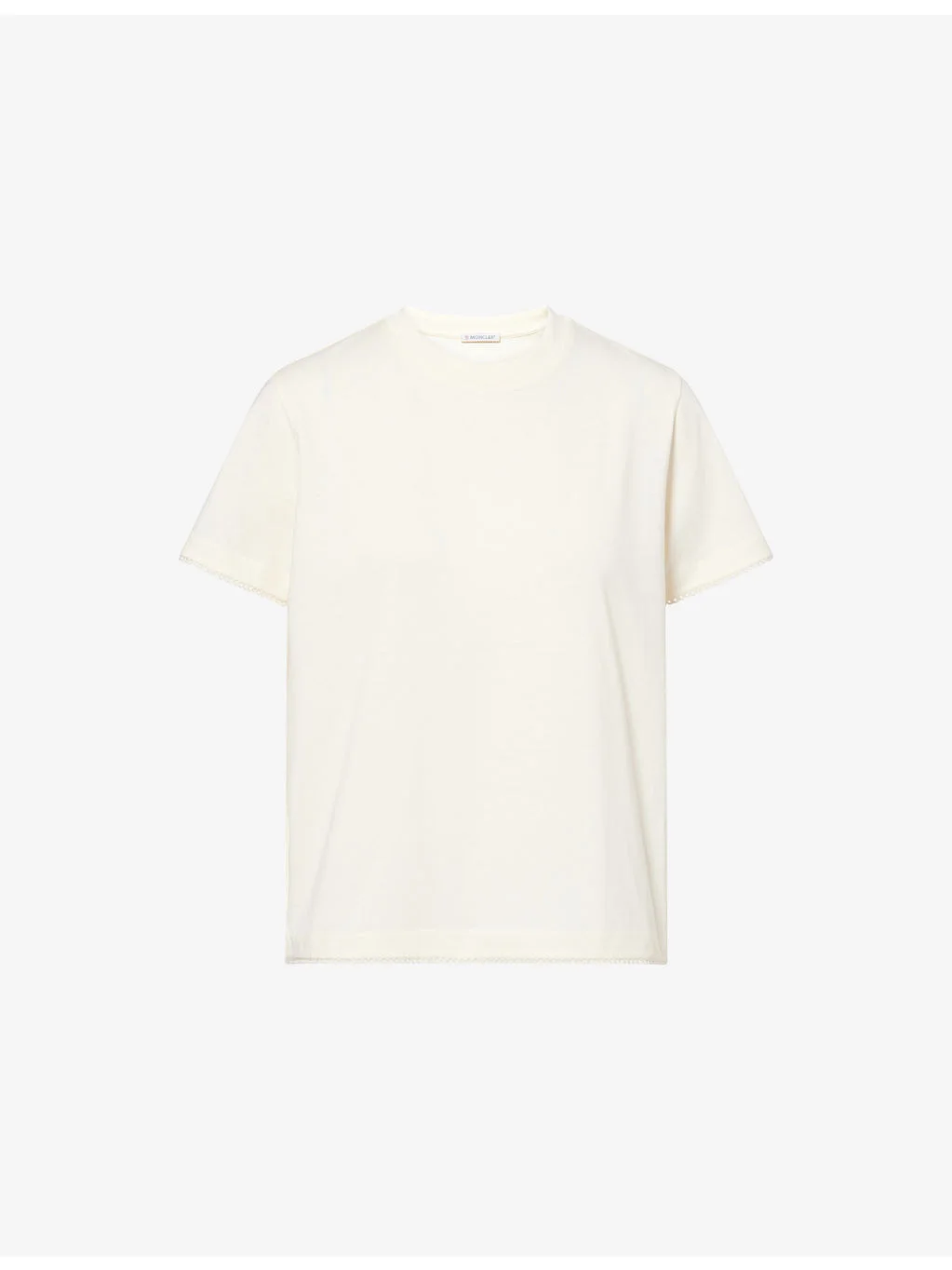 PRODUCT DETAILS - Moncler cotton-jersey T-shirt - 100% cotton - Regular fit, crew neck, short sleeves, logo patch at sleeve, picot trims - Machine wash cold - True to size - Model is 5ft 10in/1.78m and wears a size small - Lightweight, slight stretch Ref: R04593474