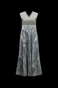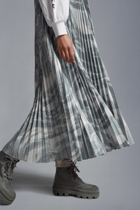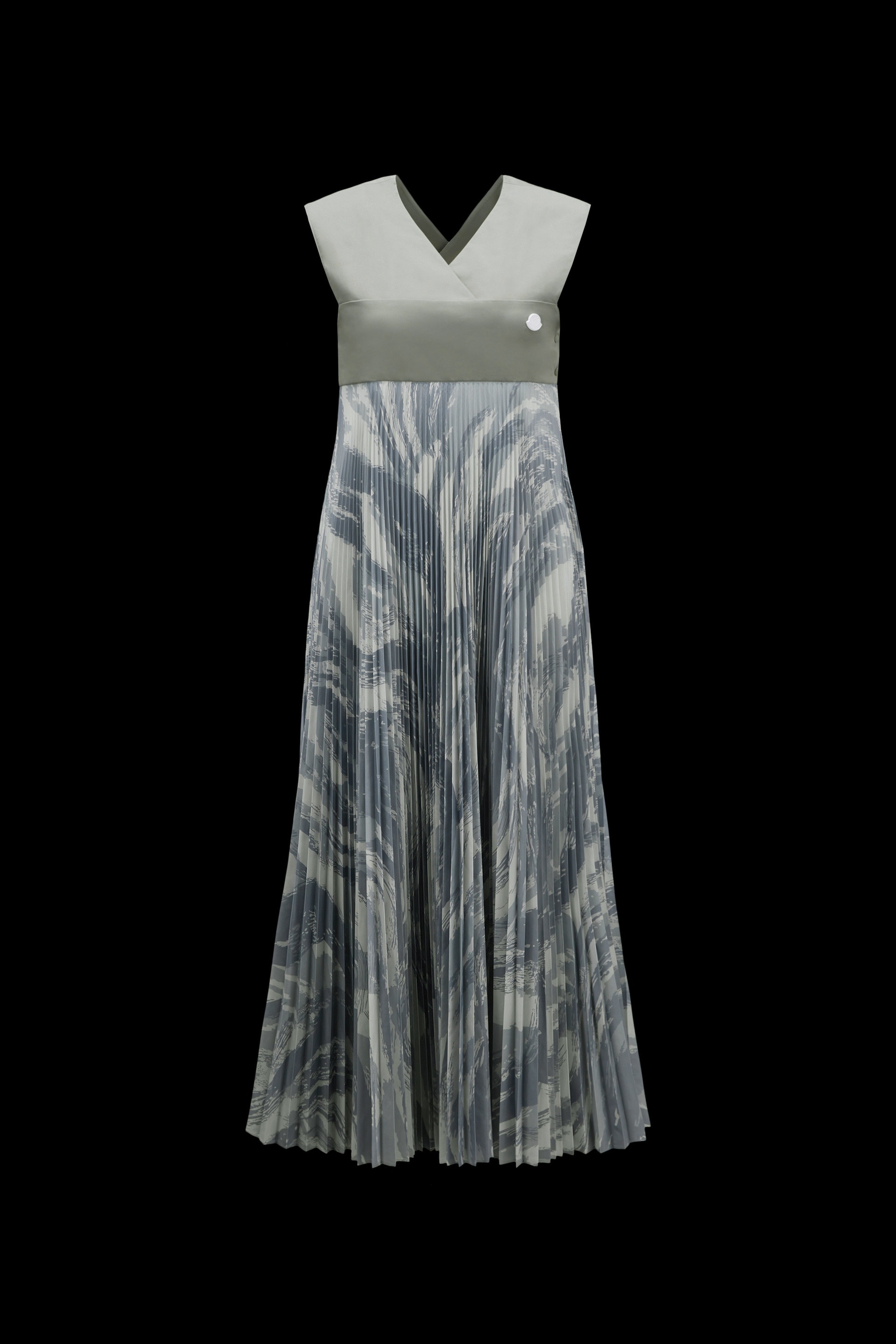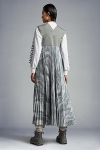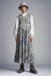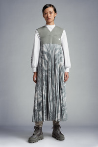 A minimalist design from the 4 Moncler HYKE collection for women, these pleated dress boasts an outdoor-inspired print. Easily styled alone or layered over a t-shirt, this maxi dress features a sleeveless twill top, high waist and a pleated skirt. - Crafted from polyester - V neck - Sleeveless twill top - Pleated bottom - Hidden zipper closure and metal snap button closure - Silicone logo SIZE AND FIT - The model is wearing a size 40 and is 177 cm tall - The model measures: bust 77 cm, waist 60 cm, hips 85 cm COMPOSITION AND CARE BOTTOM: 100% Polyamide / Nylon; BASE FABRIC: 63% Polyester, 37% Elastomultiester Do not wash; Do not bleach; Do not tumble dry; Ironing maximum temperature 110°C - without steam; Dry cleaning in tetrachloroethene or with hydrocarbons - mild process; Do not professionally wet clean; Flat dry in the shade; Wash separately; do not iron pleated fabric; It is advisable to wash and iron with the garment on reverse. Product code H209K2G00001M2521F92 Made in Italy