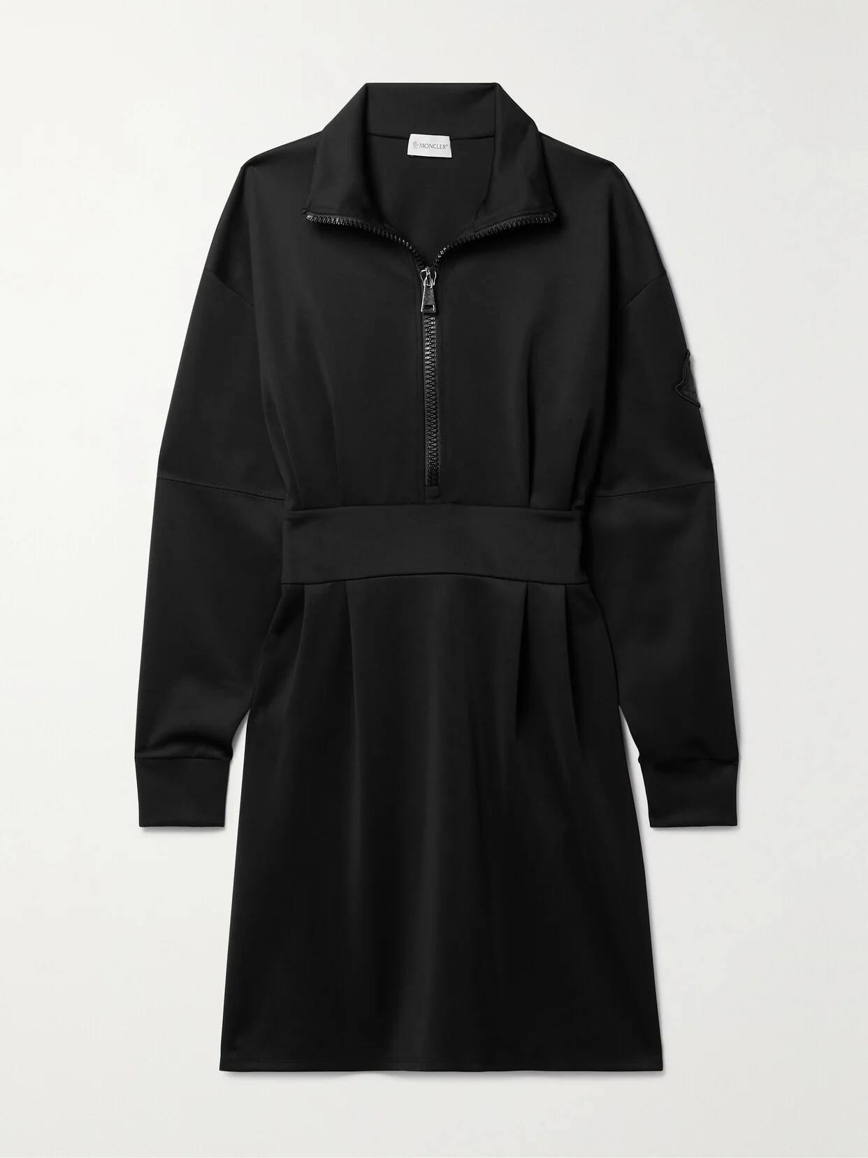 Moncler's dress is fitted with a an adjustable zipped collar for a subtle sporty feel. Cut from black ponte, it has a cinched waist that balances the pleated mini skirt and an appliqued logo patch on one sleeve. Wear yours with the label's boots.