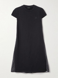 Moncler's mini dress innovatively blends two styles in one. Designed with a comfortable cotton-jersey front panel, it turns to reveal a pleated shell reverse that creates floaty movement. A sharp eye will notice the tonal logo applique at the chest. Size & Fit - Fits true to size, take your normal size - Designed for a slightly loose fit - Lightweight, slightly stretchy fabric with non-stretchy panels - Model is 180cm/ 5'11" and is wearing a size Small Model measurements: - Bust: 83cm/ 33" - Waist: 66cm/ 26" - Hip: 95cm/ 37.5" Details & Care - Black cotton-jersey and shell - Slips on - Fabric1: 100% cotton; fabric2: 100% polyester - Hand wash