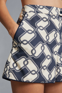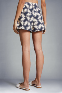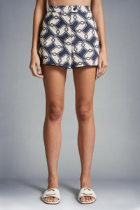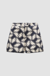 Inspired by summers in Biarritz, these printed shorts for women are featured in shades of blue and white. A summer getaway must-pack, these shorts are crafted from cotton in a navy and white chain print. The style pairs perfectly with a lightweight jacket in a matching print. - Crafted from cotton - Button and zipper closure - Pockets SIZE AND FIT - The model is wearing a size 40 and is 177 cm tall - The model measures: bust 73 cm, waist 60 cm, hips 88 cm COMPOSITION AND CARE BASE FABRIC: 100% Cotton Wash max 30°C - Mild process; Do not bleach; Do not tumble dry; Ironing maximum temperature 110°C - without steam; Dry cleaning in tetrachloroethene or with hydrocarbons - mild process; Professional wet cleaning - mild process; Flat dry in the shade; Wash separately; It is advisable to wash and iron the garment on reverse.; Iron with a cloth between Product code J10932B00009597MIF70 Made in Hungary