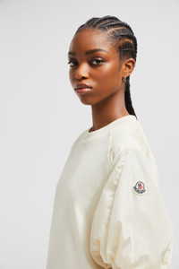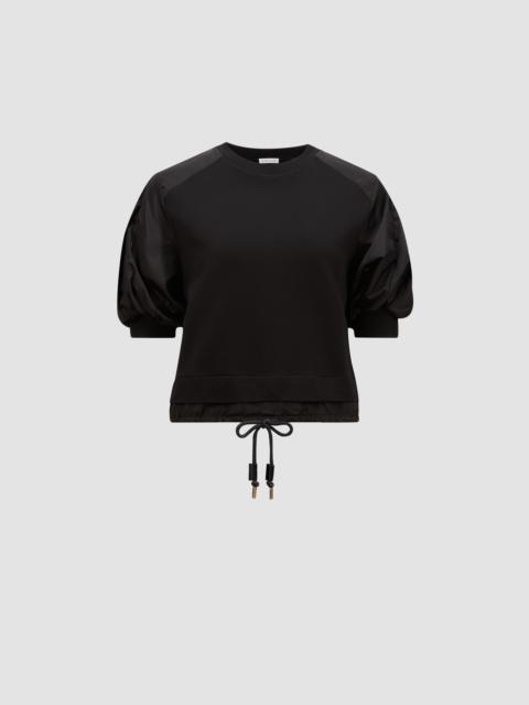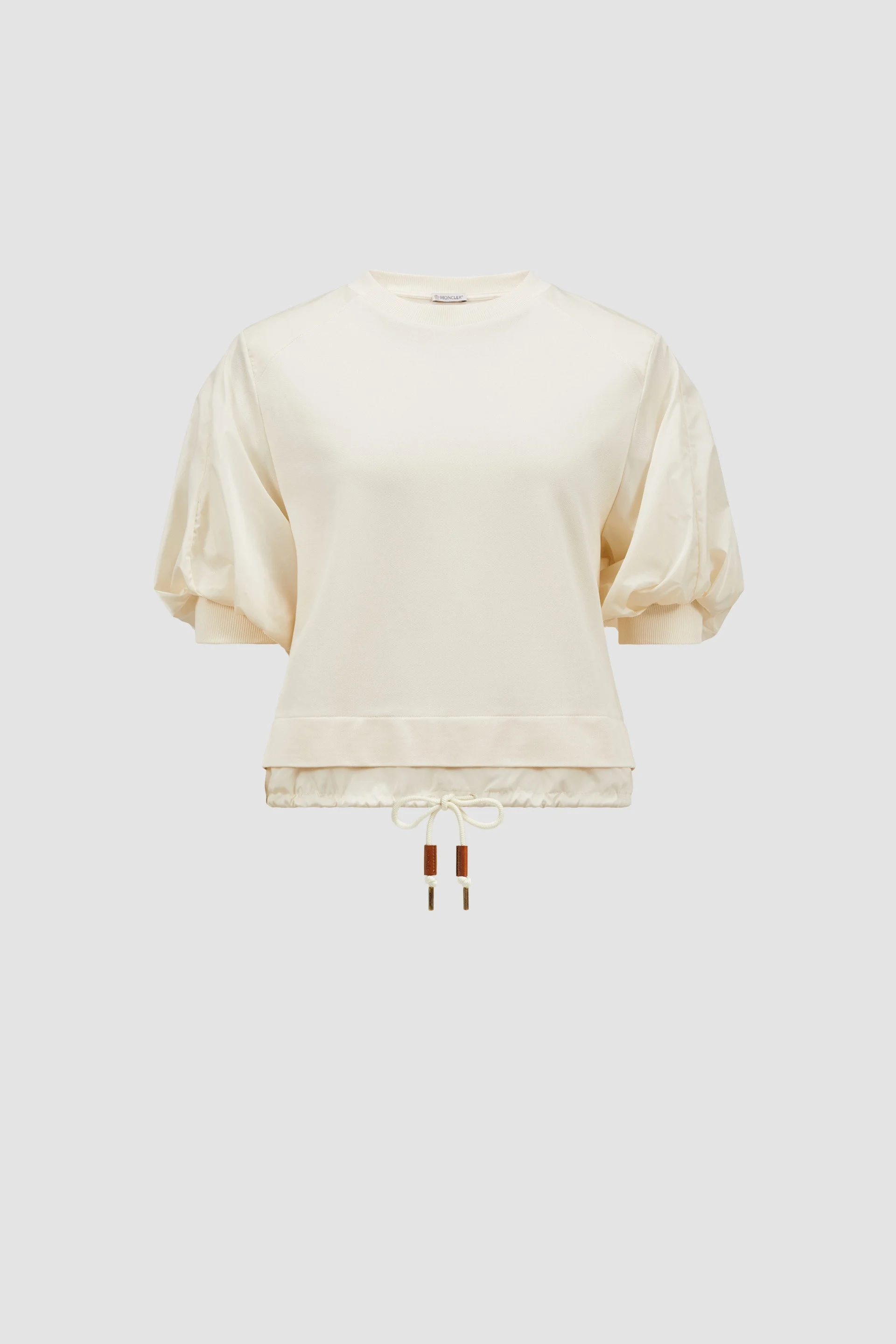 Playing with proportions and textures, this t-shirt for women is a contemporary interpretation of a daily staple. Characterized by unexpected elements, this t-shirt is crafted from a mix of cotton fleece and nylon. The top contrasts an oversized fit with feminine puffed sleeves and a cinched waistband. DETAILS - Crafted from cotton fleece - Nylon yoke, sleeves and hem - Crew neck - Short sleeves with mesh lining - Hem with drawstring fastening SIZE AND FIT - The model is wearing a size XS and is 178 cm tall - Oversized fit COMPOSITION BASE FABRIC: 100% Cotton; 1 MATERIAL: 100% Polyamide / Nylon; SLEEVES LINING: 100% Polyester; Ribs: 97% Cotton, 3% Elastane / Spandex Product code K10938C0002289A1K034 Made in Turkey