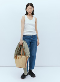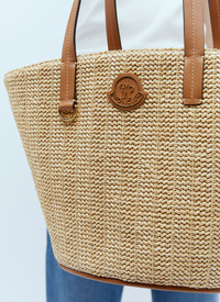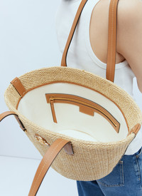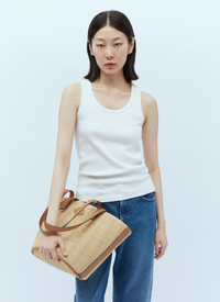 Hubba small tote bag in woven construction with leather trims. - Twin top handles - D-ring at handle - Open top - Front logo patch - One main compartment - Interior zip pocket - Fully lined - 53% Viscose, 31% Cotton, 16% Polyester. Contrast: 100% Leather - Color: Beige - Code: 5D00009 M4231 F22
