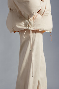Fully embracing the 2 Moncler 1952 outdoor roots, the Raimi short down jacket for women is designed to protect from the elements. A feminine design, the Raimi down jacket features an oversized silhouette adjustable with delicate lacing on the sides. Crafted from coated cotton canvas, the short puffer is lightweight, yet water-repellent. The neutral-tone design is enlivened with zesty, glossy lining. - Crafted from coated cotton canvas - Nylon laqué lining - Down-filled - Zipper closure - External patch pockets with snap button closure - Cotton and polyester ribbon side with metal eyelets and drawstring with cord ends and spiral motif - Adjustable hem with elastic drawstring fastening - Adjustable cuffs with recycled drawstring fastening - Ribbon-embroidered logo patch SIZE AND FIT - The model is wearing a size 0 and is 180 cm tall - The model measures: chest 79 cm, waist 60 cm, hips 88 cm - Oversized fit COMPOSITION AND CARE EXTERIOR: 100% Cotton; LINING: 100% Polyamide / Nylon; PADDING: 90% Down, 10% Feather Wash max 30°C - Very mild process; Do not bleach; Do not tumble dry; Ironing maximum temperature 110°C - without steam; Do not dry clean; Professional wet cleaning - very mild process; Flat dry in the shade; Wash separately; It is advisable to wash and iron the garment on reverse.; PROTECT TRIMS WHILE WASHING Product code H20941A00010M2261070 Made in Romania