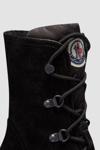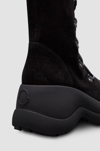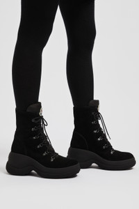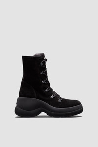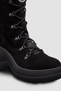 A winter boot is given the feminine treatment in the Resile Trek lace-up style from the women's collection. Warm and comfortable, the ankle boots are crafted from water-repellent suede and nylon. Lacing references Moncler's mountaineering roots, while the sculptural wedge adds feminine elevation. DETAILS - Water-repellent suede and nylon upper - Leather lining - Lace-up - TPU sole with PU insert - Made in Italy - Calf height 16 cm - Sole height 8.5 cm COMPOSITION UPPER: 100% Polyamide / Nylon; SOLE: 100% Elastodiene;UPPER: COW; LINING: COW Product code J209B4F00240M3647999 Made in Italy