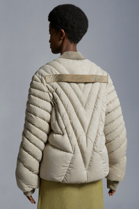 Crafted from garment-dyed nylon, the Radiance Flight is a down-filled bomber jacket for men and women from the Moncler + Rick Owens collection. Emblematic of the collection's bold and modern aesthetic, the Radiance Flight down jacket is featured in a bomber silhouette. Crafted from garment-dyed nylon, the short puffer is characterized by a radial quilting pattern. A ribbon on the back allows the genderless jacket to be carried on the shoulder. - Crafted from garment-dyed nylon - Garment-dyed nylon lining - Down-filled - Radial-quilted - Ribbed collar and cuffs in Garment-dyed cotton - Zipper closure - Outer welt pockets with snap button closure - Inner pockets with snap button closure - Ribbon with rivets on the back - Logo patch SIZE AND FIT - The female model is wearing a size 0 and is 177 cm tall - The female model measures: bust 73 cm, waist 59 cm, hips 87 cm - The male model is wearing a size 2 and is 189 cm tall - The male model measures: chest 79 cm, waist 69 cm, hips 88 cm, - Slim fit COMPOSITION AND CARE LINING: 100% Polyamide / Nylon; PADDING: 90% Down, 10% Feather; DETAILS PADDING: 100% Polyester; 1 MATERIAL: 90% Cotton, 9% Polyamide / Nylon, 1% Elastane / Spandex; BASE FABRIC: 100% Polyamide / Nylon Wash max 30°C - Mild process; Do not bleach; Do not tumble dry; Ironing maximum temperature 110°C - without steam; Dry cleaning in tetrachloroethene or with hydrocarbons - mild process; Professional wet cleaning - mild process; Flat dry in the shade; Wash separately; do not soak; It is advisable to wash and iron the garment on reverse. Product code I209N1A00006M385522D Made in Romania
