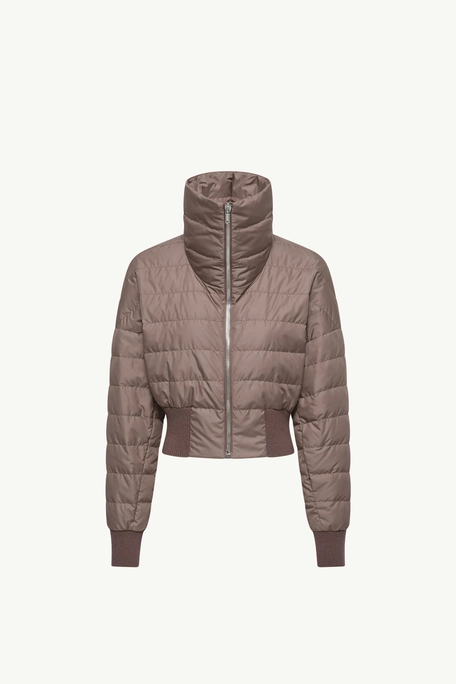 An architectural study rendered in fabric and form, the Cropped down jacket for women stands out for its bold proportions. Minimal yet monumental, the Moncler + Rick Owens Cropped down jacket distills architectural geometry into a cropped silhouette. Playing with contrasts, the puffer pairs taffeta - a crisp fabric with a subtle sheen - with soft wool-blend trims. A convertible collar completes the design, shifting from a sculptural turtleneck to an open neckline. DETAILS - Crafted from polyester taffeta - Ultra-light polyester lining - Wool blend knit trim - Down-filled - Stand collar - Zipper closure - Zipped pockets - Embroidered logo patch SIZE AND FIT - The model is wearing a size 0 and is 180 cm tall - Loose fit - Length (collar to hem): 50 cm COMPOSITION BASE FABRIC: 100% Polyester; LINING: 100% Polyester; PADDING: 90% Down, 10% Feather; DETAILS PADDING: 100% Polyester; 1 MATERIAL: 91% Virgin wool, 4% Polyamide / Nylon, 4% Polyester, 1% Elastane / Spandex Product code L109N1A00005M8115828 Made in Romania