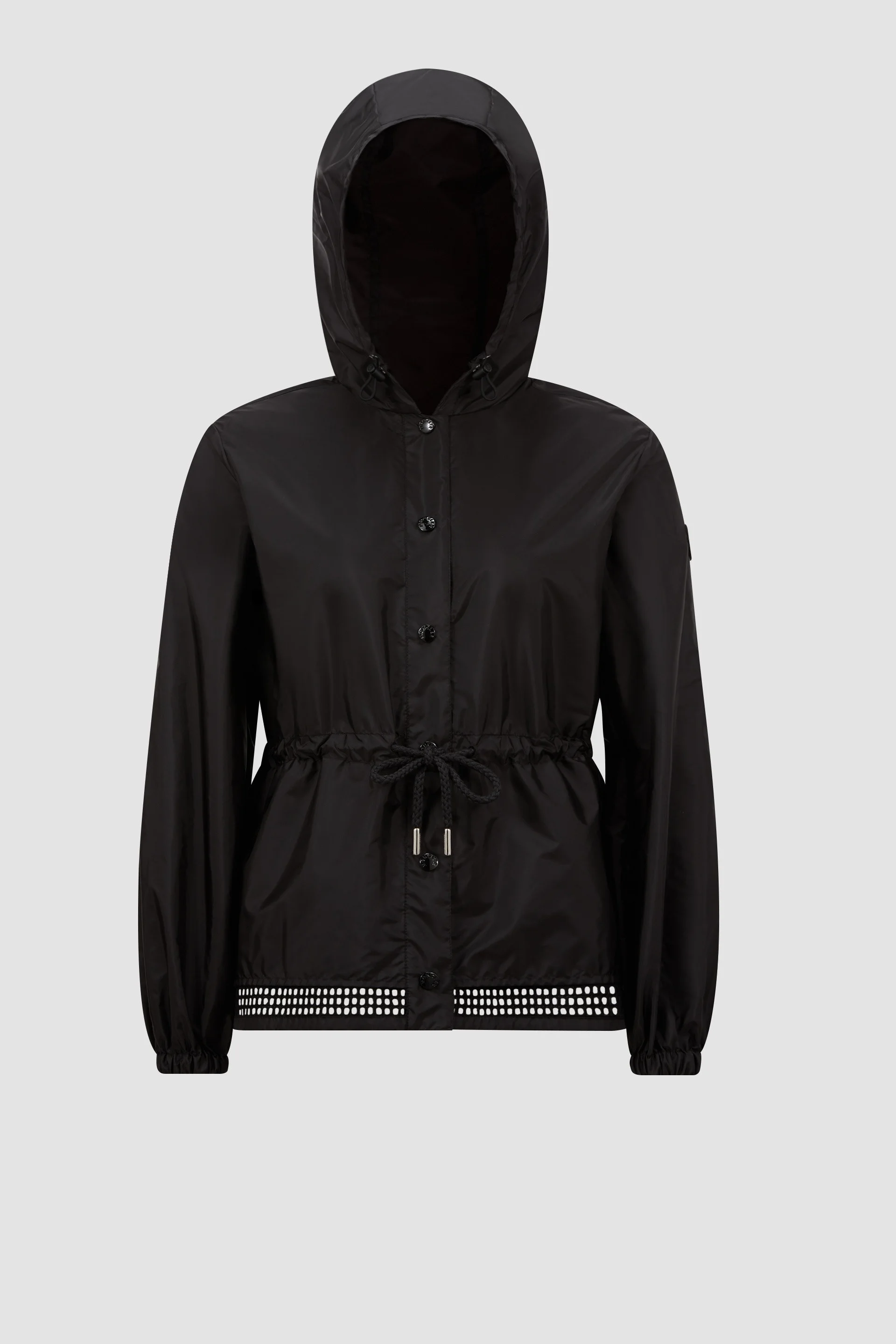 Adding a feminine touch to an essential jacket, the Rochebonne pairs silky fabrics with delicate broderie anglaise. Encapsulating everyday elegance, the Rochebonne is crafted from technical taffeta. The nylon fabric is ideal for mild conditions with a water-repellent finish and light weight. Adding a refined feel, the design features a broderie anglaise trim. The hooded design comes in a soft shape with a cinched waist. DETAILS - Crafted recycled nylon technique taffeta - Adjustable hood - Snap button closure - Pockets - Waistband with drawstring fastening - Broderie anglaise trim - Logo patch SIZE AND FIT - The model is wearing a size 0 and is 178 cm tall - •Regular fit - •Drawstring allows personalization COMPOSITION EXTERIOR: 100% Polyamide / Nylon; OUTER BOTTOM: 78% Cotton, 16% Polyester, 6% Polyamide / Nylon Product code K10931A00134539ZD999 Made in Italy