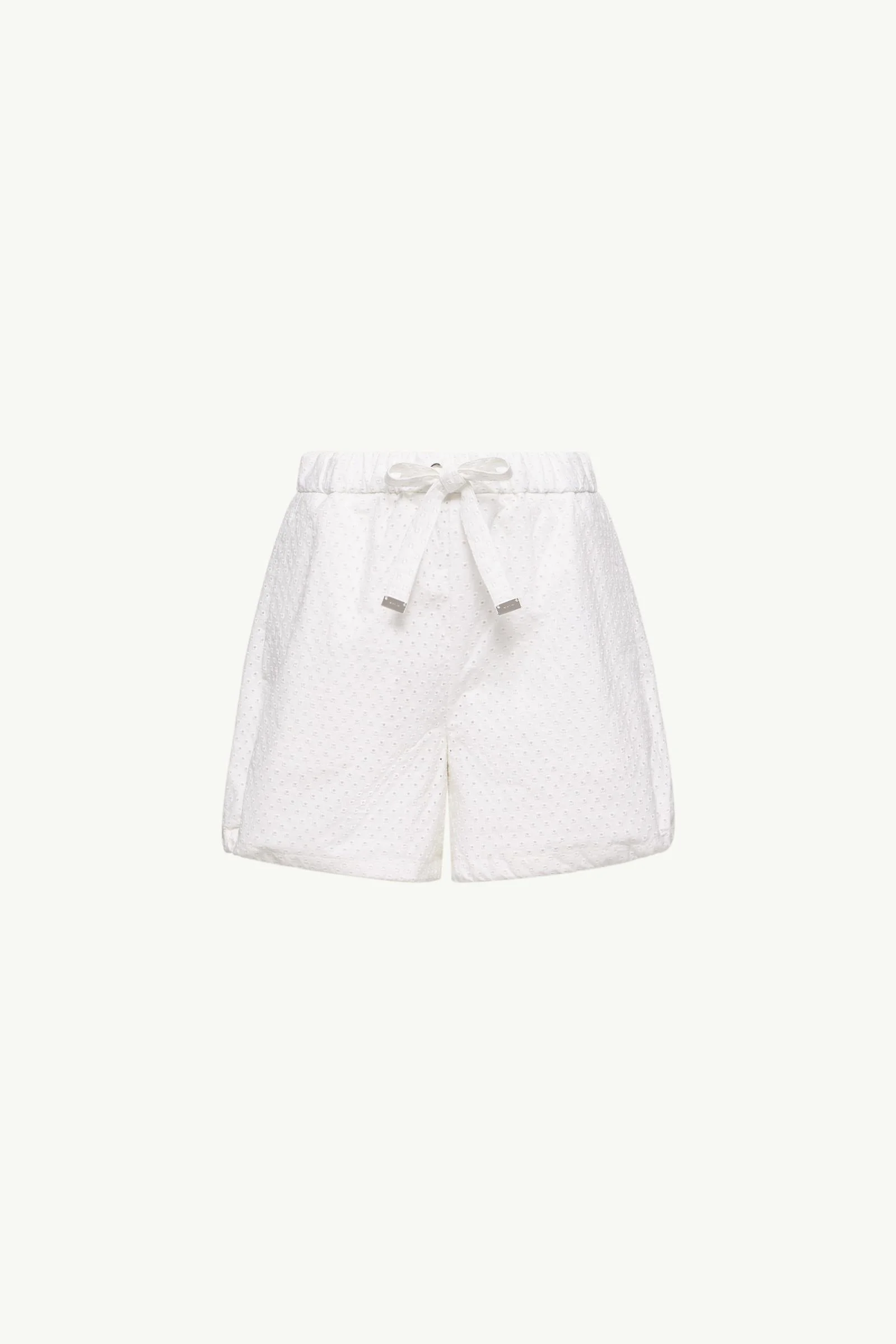Lightness meets elegance in this pair of San Gallo shorts, creating a new interpretation of a summer staple. Reimagining a classic summer fabric, poplin is combined with polka dot San Gallo. The shorts feature an elastic waistband and adjustable hem, ensuring comfort throughout the day. DETAILS - Crafted from San Gallo poplin - Elasticized waistband - Drawstring at the hem - Seam pockets and two back patch pockets - Logo patch SIZE AND FIT - The model is wearing a size 40 and is 180 cm tall COMPOSITION EXTERIOR: 100% Cotton; LINING: 100% Cotton; Embroidery: 91% Cotton, 9% Polyester Product code L10932B00010597LQ001 Made in Hungary