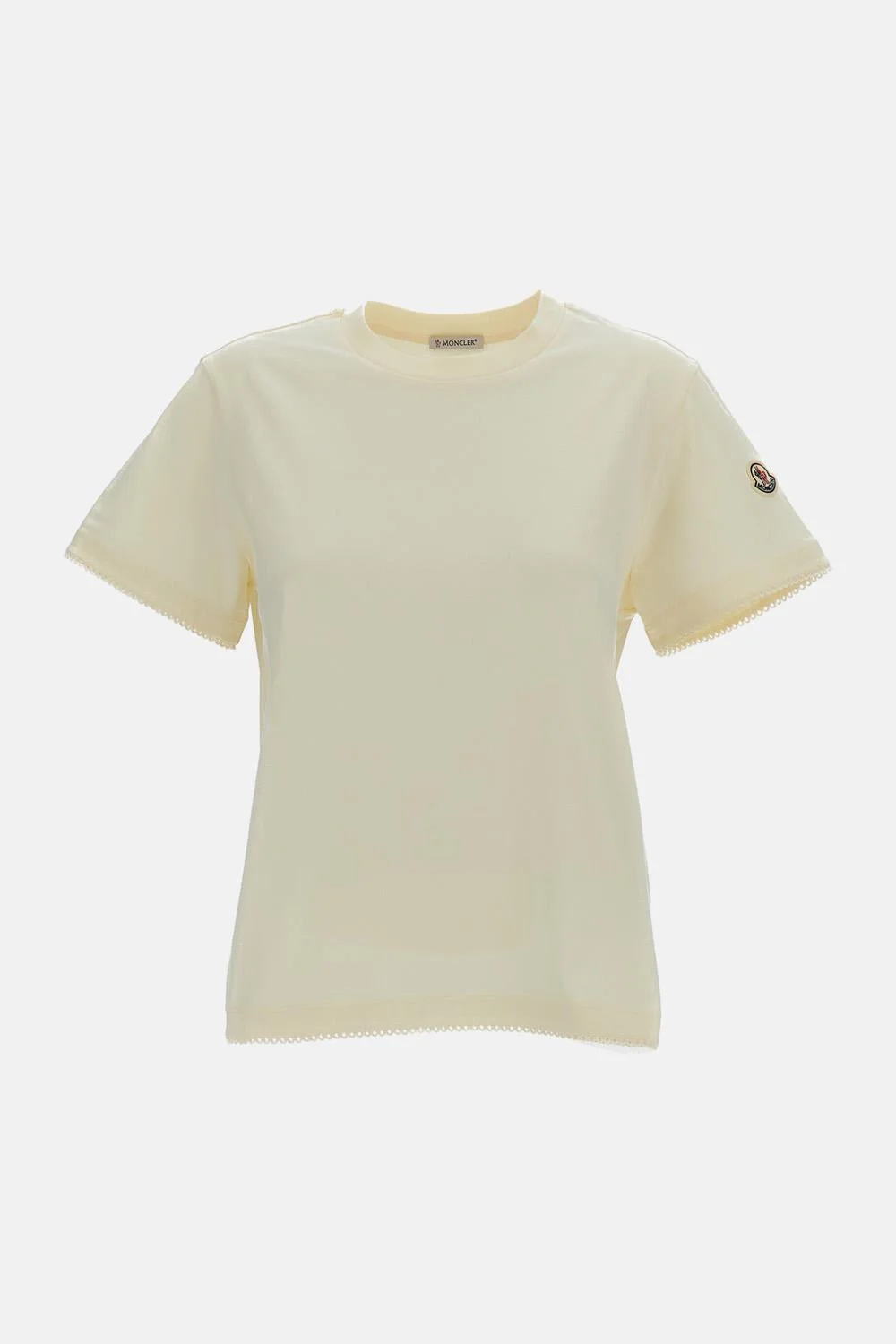 Short-sleeve crew-neck cotton T-shirt Wavy finishes Comfortable fit Ribbed collar trim Logo patch on the sleeve Color: White Details and Care Color: Beige Composition: 100% COTONE Made in: Turchia Sku: 8C0002789AUO034