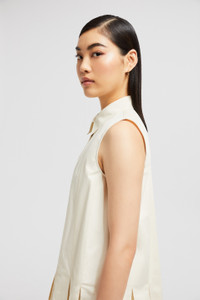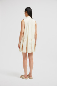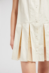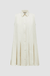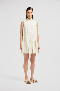 A feminine interpretation of a shirt dress, this design for women features a pleated skirt with silk organza accents. A breezy summer design, this shirt dress is crafted from crisp cotton poplin. The piece boasts a pleated skirt with sheer silk panels, adding a romantic twist. Available in a timeless color palette, the style is ideal for elegant monochrome looks. DETAILS - Crafted from organic cotton poplin - Collar - Sleeveless - Snap button closure - Pleated skirt with silk organza panels - Logo patch SIZE AND FIT - The model is wearing a size 40 and is 178 cm tall COMPOSITION EXTERIOR: 100% Cotton; LINING: 100% Cotton; 1 MATERIAL: 100% Silk Product code K10932G00011597LQ050 Made in Romania