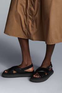 Versatile and luxurious, the Solarisse sandals for women are crafted from supple nappa leather. A statement design, the Solarisse sandals feature a bold, yet ultra-light sole and voluminous crisscross straps. Crafted from supple nappa leather, the flat sandals can be easily styled from morning to evening and from the office to the summer vacation. - Crafted from nappa leather - Leather strap with buckle closure - Ultralight sole - Sole height 3.5cm COMPOSITION AND CARE SOLE: 100% Elastodiene;UPPER: LAMB; LINING: LAMB To protect your purchase over time, we recommend the shoes be cleaned using a brush with soft natural bristles or a slightly damp soft cloth. Before cleaning, make sure that the shoes are completely dry. After brushing, apply an appropriate amount of cleaning product to the leather and create small circular motions with a soft dry cloth. For suede shoes, please use a special rubber brush. We also recommend the use of a suitable water-repellent product before wearing the shoes in wet conditions. Dry away from direct heat. Finish the cleaning using a dry clean cloth. Store in the felt bag provided at the time of purchase. Product code H109B4L00120M1699999 Made in Italy