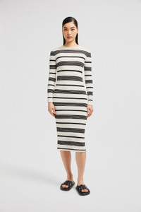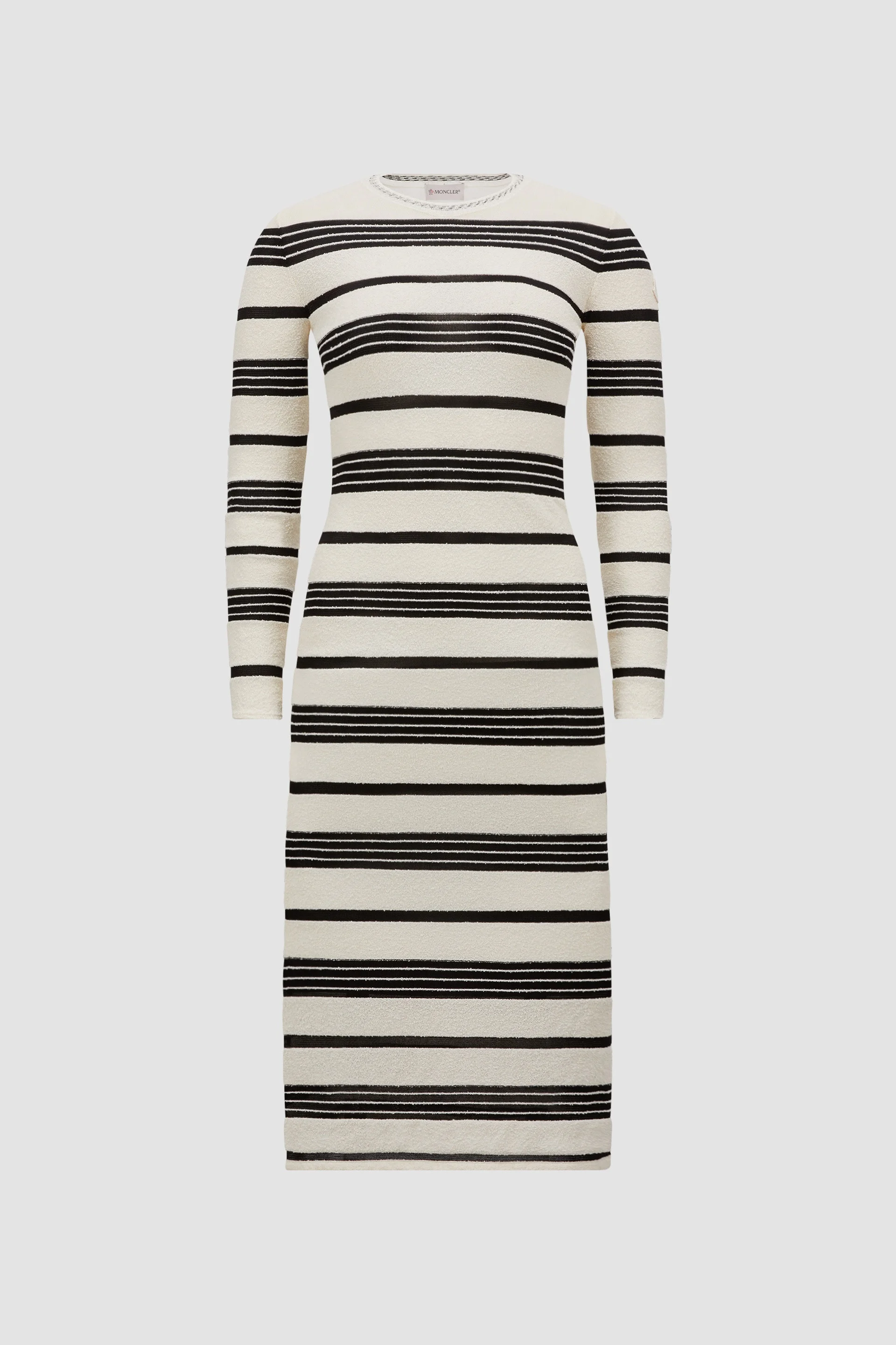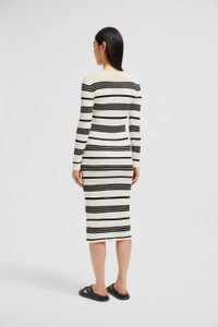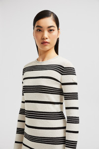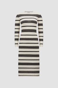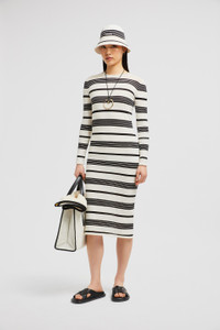 Characterized by a classic striped pattern, this midi dress for women encapsulates the collection's maritime feel. Evocative of vintage sailor imagery, horizontal stripes animate this midi dress. The style is knit from lightweight boucle fabric, further accentuated by sheer organza details at the shoulders. DETAILS - Crafted from viscose, cotton boucle and nylon blend - Fully-fashioned knit - Gauge 14 - Crew neck - Organza shoulders - Long sleeves - Logo patch SIZE AND FIT - The model is wearing a size XS and is 178 cm tall - Slim fit COMPOSITION BASE FABRIC: 74% Cotton, 26% Polyamide / Nylon; YOKE: 82% Cotton, 18% Polyamide / Nylon; 1 MATERIAL: 100% Viscose / Rayon Product code K10939L00015M6334P90 Made in Romania