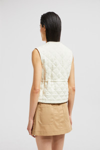 An elevated essential for mild days, the women's Vigny vest blends sophisticated materials with lightweight quilting. A crisp piece for milder months, the Vigny vest is crafted from linen. The sophisticated material is paired with a quilted diamond pattern, adding a classic feel while remaining light. A nipped in waistline and round neck complete the warmer with a feminine feel. DETAILS - Crafted from linen - Recycled polyester lining - Herringbone cotton trim - Padded - Zipper closure - Patch pockets - Chest pocket - Waistband and hem with elastic drawstring fastening SIZE AND FIT - The model is wearing a size 0 and is 180 cm tall - Regular fit - Drawstring allows personalization COMPOSITION EXTERIOR: 100% Flax/Linen; LINING: 100% Polyester; PADDING: 100% Polyester; 1 MATERIAL: 100% Flax/Linen; 2 MATERIAL: 100% Polyester Product code K10931A00100788PY050 Made in Moldova