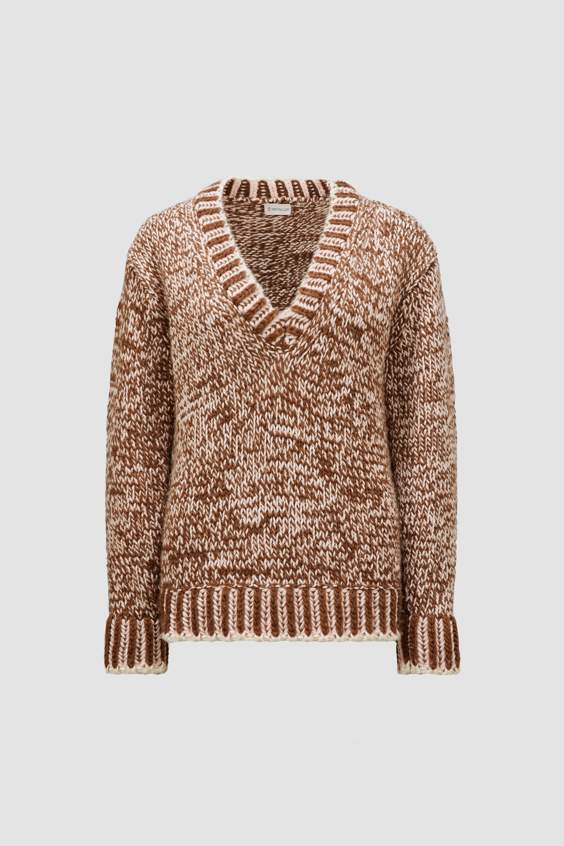 Showcasing a feminine V-neck silhouette, this heavy knit sweater from the women's collection is crafted from wool. Designed for the coldest months, this sweater is crafted from a wool blend that guarantees ultimate warmth. The knit features a deep v-neck while a striped trim adds a graphic element to the design. DETAILS - Crafted from a responsibly sourced wool and acrylic blend - Mouline stockinette stitch - Gauge 1.5 - V-neck SIZE AND FIT - The model is wearing a size XS and is 177 cm tall - The model measures: bust 80 cm, waist 62 cm, hips 89 cm - Oversized fit COMPOSITION BASE FABRIC: 70% Virgin wool, 30% Acrylic Product code J20939D00002M4708P25 Made in Italy