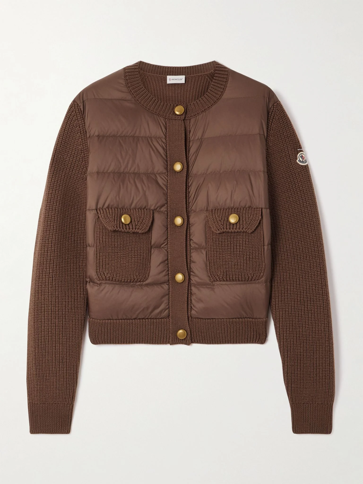 Moncler's 'Archivio DNA' cardigan is quilted and padded with insulating down through the body, so it offers ample warmth for transitional weather. It's made from a combination of ribbed wool and shelll and finished with gold-tone buttons. Size & Fit - Fits true to size, take your normal size - Designed for a slightly loose fit - Mid-weight knit with quilted panels - Model is 177cm/ 5'10" and is wearing a size Small Model measurements: - Bust: 85cm/ 33.5" - Waist: 65cm/ 25.5" - Hip: 91cm/ 36" Details & Care - Brown wool and shell - Button fastenings through front - 100% wool; trim1: 100% polyamide; trim2: 90% down, 10% feathers (Goose) - Partially lined - Dry clean