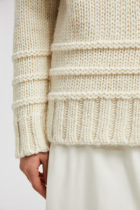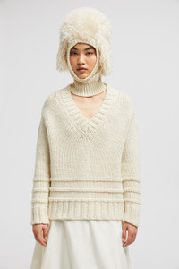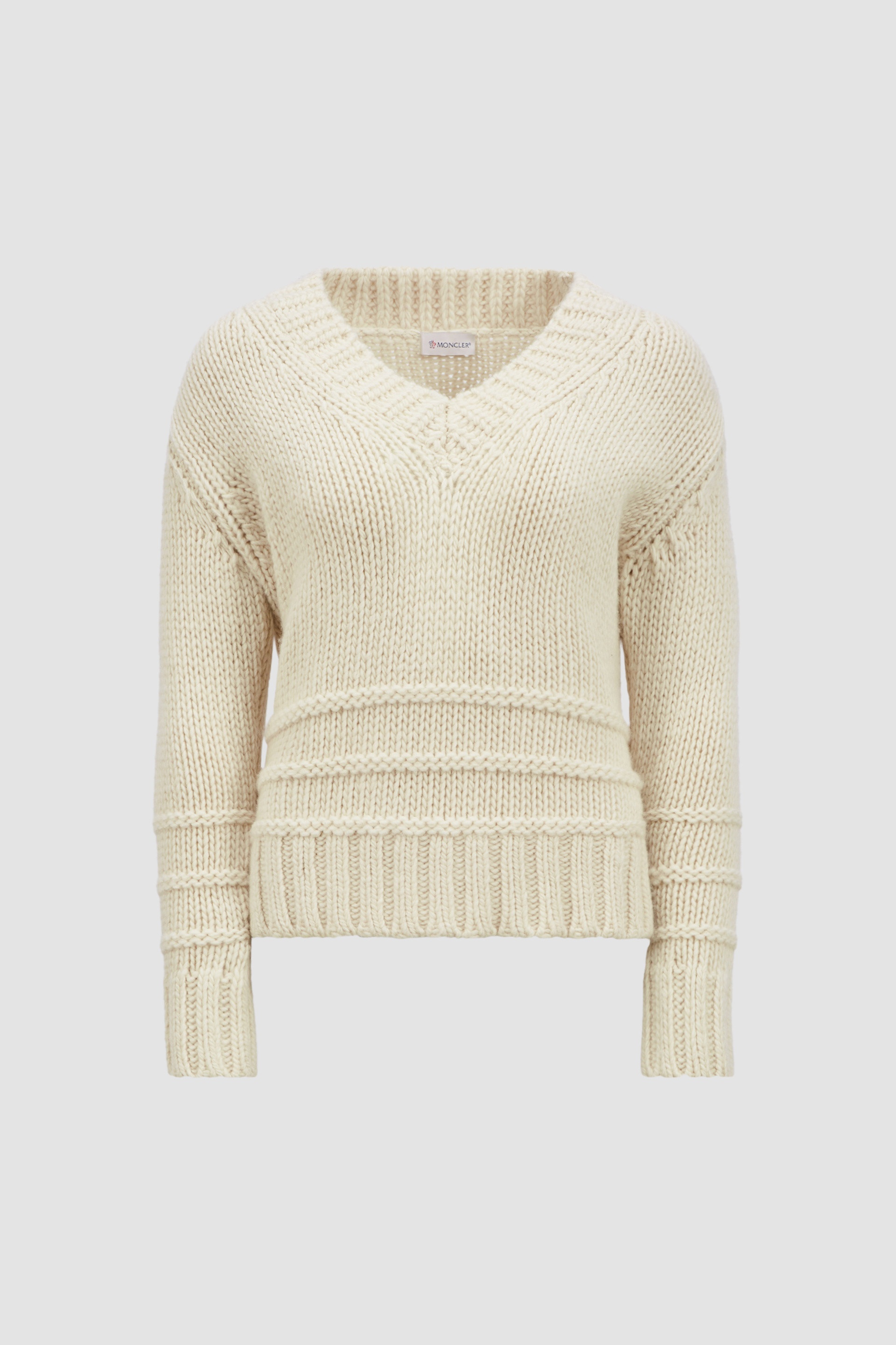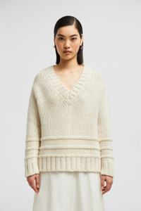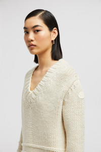 Emblematic of comfortable elegance, this V-neck sweater from the women's collection is crafted from the softest wool. Crafted using an elevated knitting technique, this V-neck sweater feminine silhouette is accentuated by a graphic texture. The heavy knit is ideal for layering over lighter pieces, elevating cold weather looks with its tactile finish. DETAILS - Crafted from responsibly sourced wool - Fully-fashioned stockinette purl stitch - Gauge 1.5 - V-neck SIZE AND FIT - The model is wearing a size XS and is 178 cm tall - The model measures: bust 76 cm, waist 62 cm, hips 91 cm - Oversized fit COMPOSITION BASE FABRIC: 70% Virgin wool, 30% Acrylic Product code J20939D00003M4708034 Made in Italy