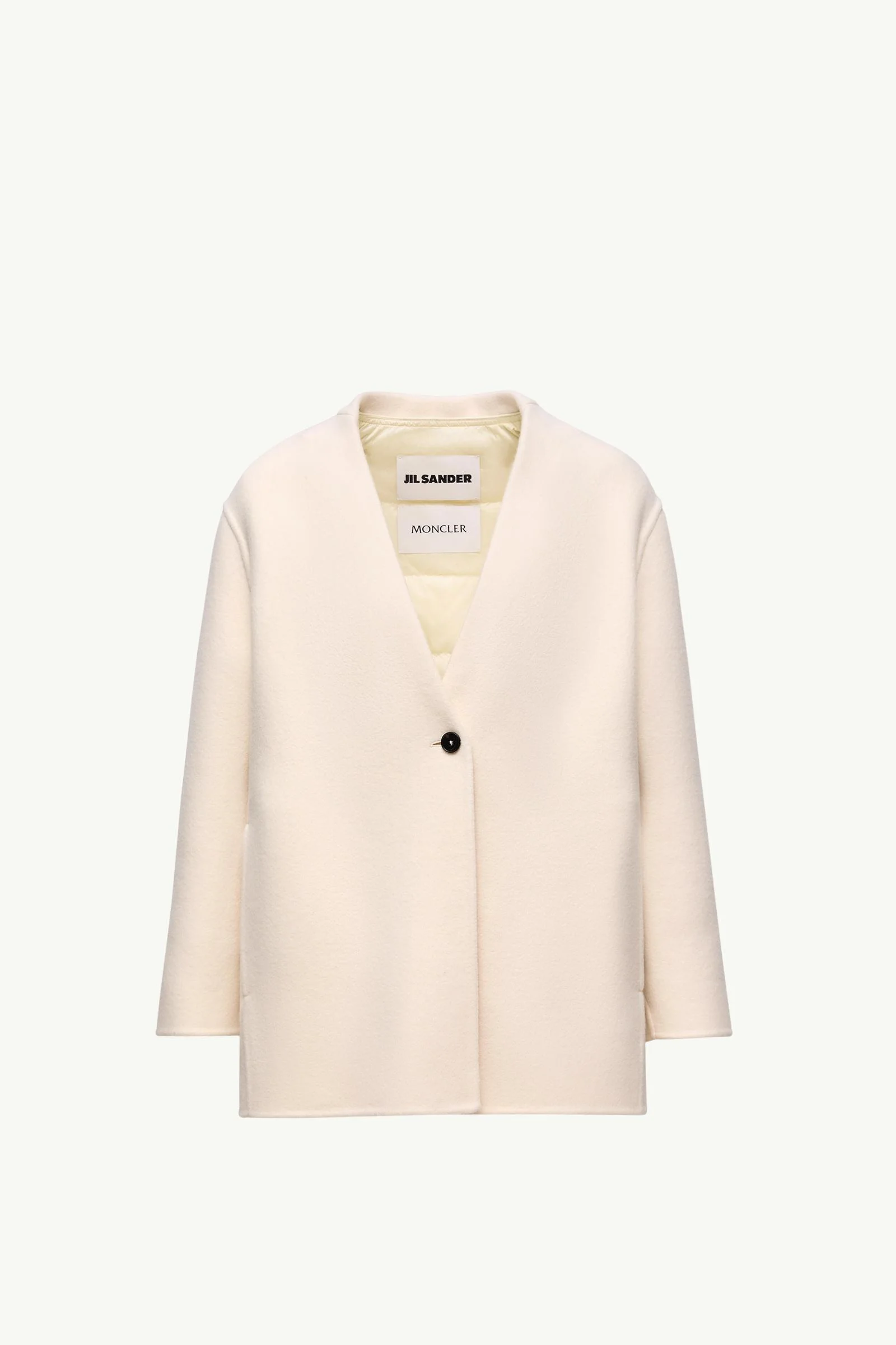 Elegance and function strike the perfect balance in the Moncler + JIL SANDER Francium short down jacket for women. Minimalist lines meet Moncler’s design codes in the Moncler + JIL SANDER Francium jacket. Crafted from double wool, the sleek silhouette is equipped with a detachable down-filled layer. Worn beneath for extra warmth or styled on its own as a down jacket, it underscores the piece’s versatile 3-in-1 nature. A metal logo, emblem of the co-creation, punctuates the design. DETAILS - Crafted from double wool - Viscose lining - Detachable down-filled nylon inner with snap button closure - Button closure - Detachable metal logo pin SIZE AND FIT - The model is wearing a size 0 and is 176 cm tall - Regular fit - Length (collar to hem): 78 cm COMPOSITION PART A: EXTERIOR: 100% Virgin wool; LINING: 100% Viscose / Rayon; PART B: EXTERIOR: 100% Polyamide / Nylon; LINING: 100% Polyamide / Nylon; PADDING: 90% Down, 10% Feather Product code K24051A00027M6407031 Made in Italy