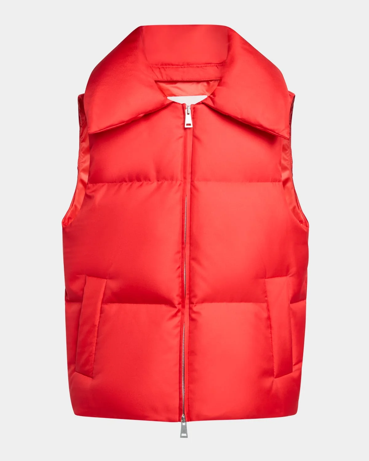 Crafted in smooth mulberry silk twill, the "Linglong" puffer vest from the Moncler x Qiu Hao collection is accented with a removable hood and foldable collar for versatile styling and supreme comfort. Features a signature jacquard logo patch on the back. Round neckine Sleeveless Side snap pockets Relaxed fit Hem falls to the hip Twoway zipfront Silk Fill: Down/feather Lining: Polyester/silk Machine wash cold Made in Italy