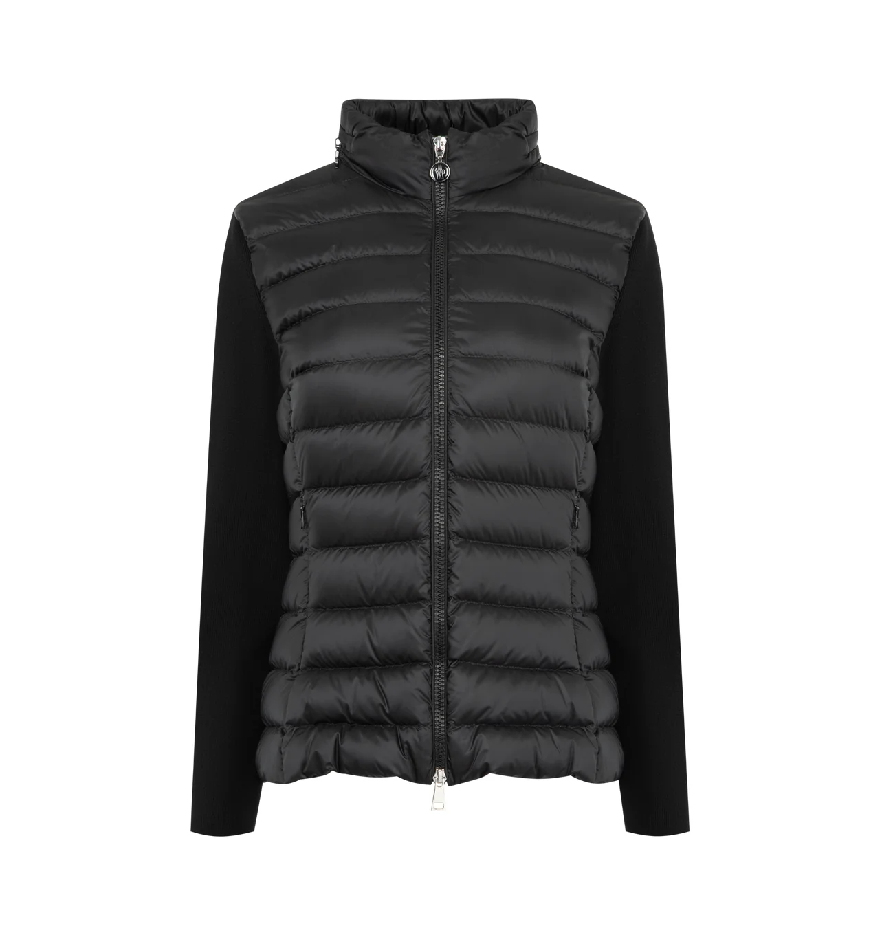 MONCLER Zip-Up Cardigan featuring longue saison lining, down-filled longue saison front, stand collar and zipper closure. 100% polyamide/nylon. 100% virgin wool. Padding: 90% down, 10% feather. DESIGNER STYLE ID: 9B000-30-M1122 COLOR: 999 BLACK