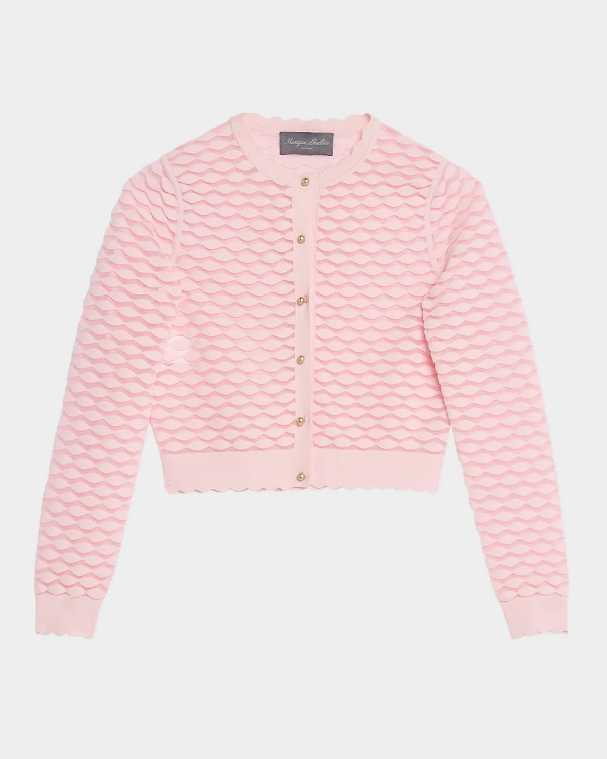 Monique Lhuillier cardigan in scallop knit with pearlescent buttons and scalloped edges Crew neckline; button front Long sleeves Fitted Cropped length Ribbed cuffs and hem Viscose/polyester/nylon/polyamide Imported