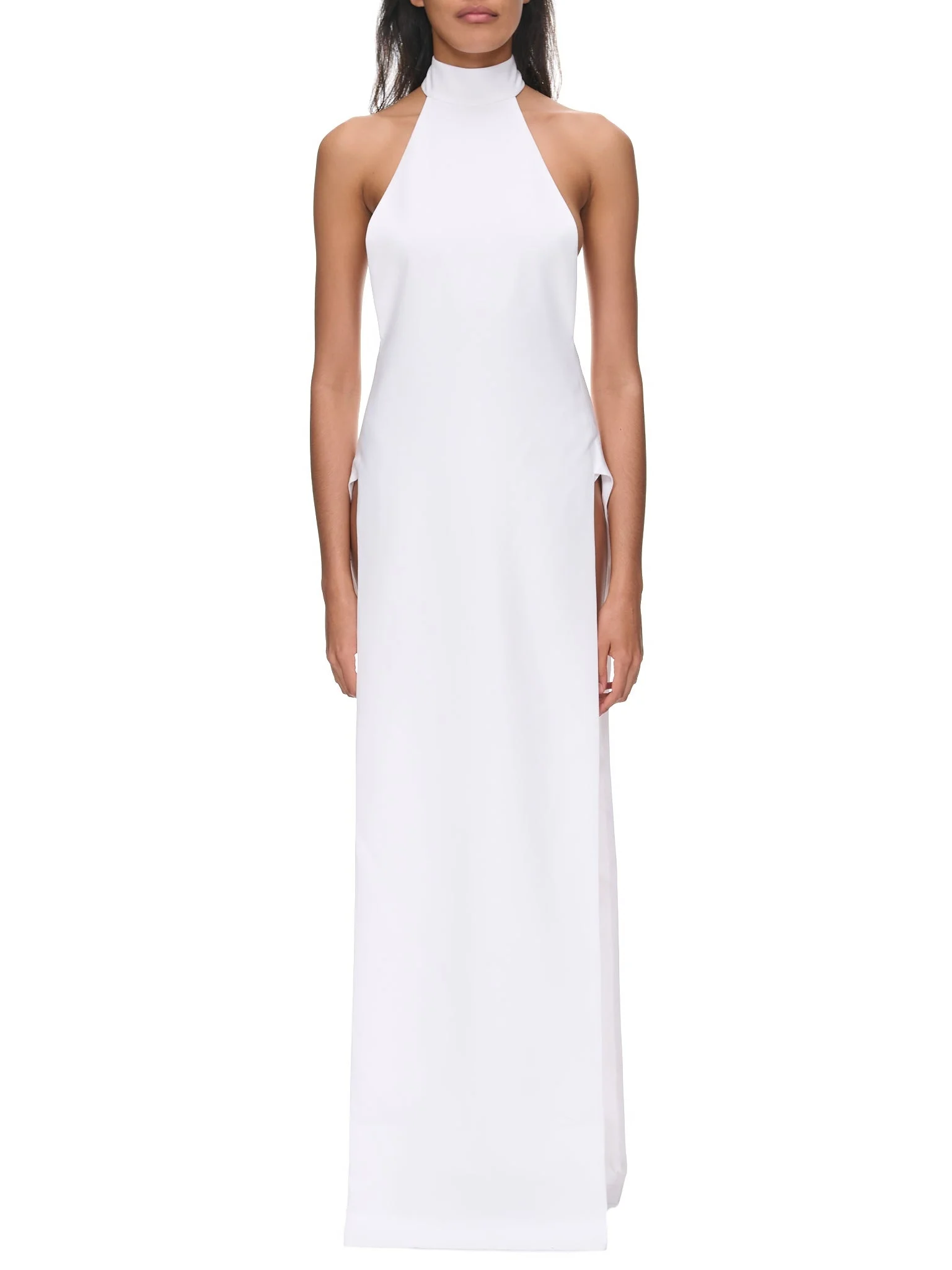 MONOT dress in white, halter-neck design, crepe construction, sleeveless, open back, high side slits, back hook eye & zip closure, slim fit. Italian Sizing 100% Crepe Model is 5'10" wearing size 38. Bust: 32" Waist: 25" Hips: 35"