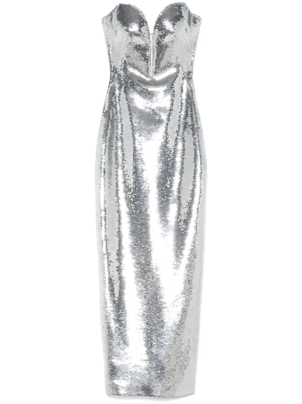 sequinned bustier midi dress Highlights - Silver-tone - Concealed rear hook and zip fastening - Boned bodice - Underwire cup - Rear slit Imported Composition Polyester 100% SIZE & FIT Model measurements Height 5 ft 10 in(1.78 m) Bust/Chest 33.85 in(86 cm) Hips 36.61 in(93 cm) Waist 26.77 in(68 cm) FittingInformation Designed for a close fit throughout The moulded cups offer shape and support Made from a midweight non-stretch fabric, this piece offers minimal elasticity when worn