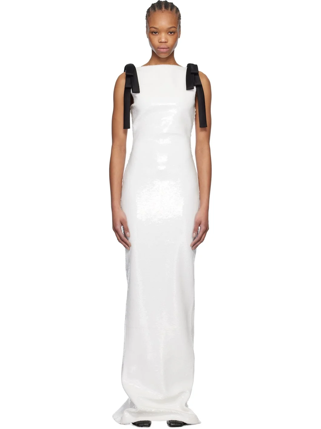 Sequinned plain-woven polyester maxi dress. · Straight neck · Satin bow at shoulders · Concealed zip closure at back collar · Central vent at back hem · Full jersey lining Supplier color: White/Black bow 100% polyester. Made in Lebanon 251658F055004