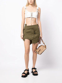 asymmetric cargo-wrap mini skirt olive green asymmetric design side cargo pocket wrap design low-rise Made in United States Composition Fabric 100% SIZE & FIT Model measurements Height 5 ft 9 in(1.76 m) Bust/Chest 31.1 in(79 cm) Hips 35.03 in(89 cm) Waist 24.4 in(62 cm) FittingInformation This piece fits true to size. We recommend you get your regular size Designed to be fitted at the waist and hips, loose over the leg Made with a mid-weight fabric Washing instructions Dry Clean Only
