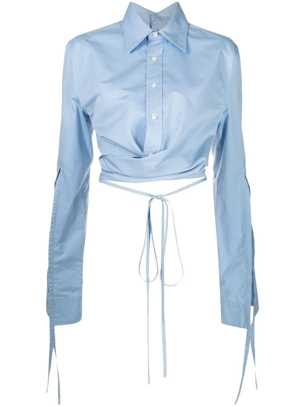 cropped wrap-front shirt light blue classic collar front button fastening long sleeves wrap design cropped rear tie fastening Imported Composition Fabric 100% Washing instructions Read Manufacturer Guidelines