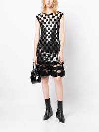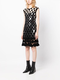 cut-out knit mini dress black/silver cotton open knit round neck sleeveless rear zip fastening flared design Made in United States Composition Cotton 100% SIZE & FIT Model measurements Height 5 ft 9 in(1.76 m) Bust/Chest 29.92 in(76 cm) Hips 35.82 in(91 cm) Waist 25.98 in(66 cm) FittingInformation This piece fits true to size. We recommend you get your regular size Cut for a slim fit Made with a mid-weight stretch fabric Washing instructions Dry Clean Only