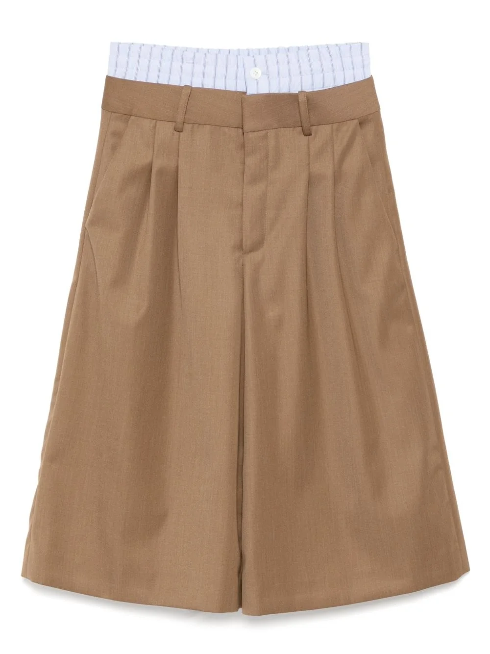 double-waistband wide leg shorts Highlights - Beige - Concealed front button, hook and zip fastening - Elasticated waistband - Two side slash pockets Made in United States Composition Outer: Wool 100% Cotton 100% SIZE & FIT Model measurements Height 5 ft 9 in(1.76 m) Bust/Chest 31.1 in(79 cm) Hips 35.03 in(89 cm) Waist 24.4 in(62 cm) FittingInformation Designed with a voluminous wide-leg fit The elasticated waist allows for a comfortable fit Made from a midweight non-stretch fabric