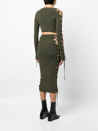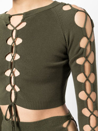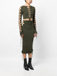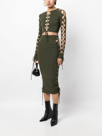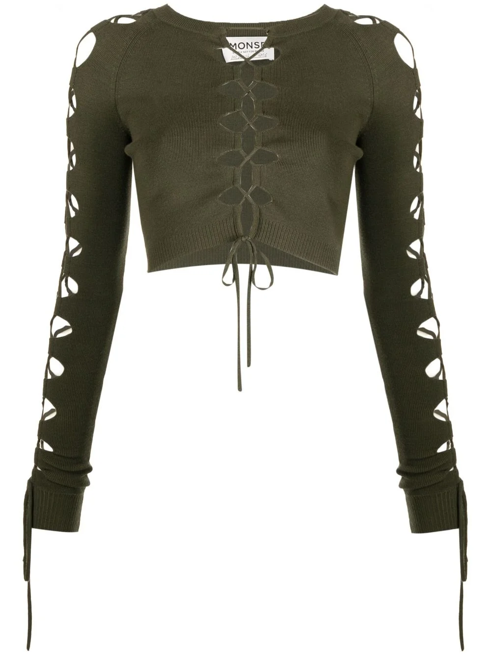 lace-up detail cropped jumper Highlights - Olive green - Cotton - Fine knit - Cut-out detailing - Front lace-up fastening - Lace-up long sleeves - Straight hem - Ribbed trim - Cropped Imported Composition Cotton 100% SIZE & FIT Model measurements Height 5 ft 10 in(1.77 m) Bust/Chest 31.49 in(80 cm) Hips 35.43 in(90 cm) Waist 25.19 in(64 cm) FittingInformation Designed for a close fit throughout Cropped in length Made with a lightweight knit, this piece offers some stretch This piece fits true to size – take your usual size Washing instructions Dry Clean Only