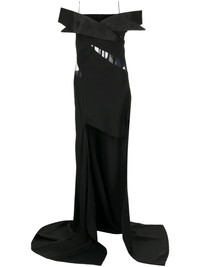 off-shoulder corset gown Highlights - Black - Off-shoulder - Corset style - Sweetheart neck - Cut-out detailing - Semi-sheer panels - Short sleeves - Fishtail train Made in United States Composition Outer: Viscose 53%, Wool 45%, Elastane 2% Silk 100%, Nylon 84%, Elastane 16% Lining: Polyester 100% SIZE & FIT Model measurements Height 5 ft 10 in(1.77 m) Bust/Chest 31.49 in(80 cm) Hips 35.43 in(90 cm) Waist 25.19 in(64 cm) FittingInformation The internal bodice offers support and shape Washing instructions Dry Clean Only