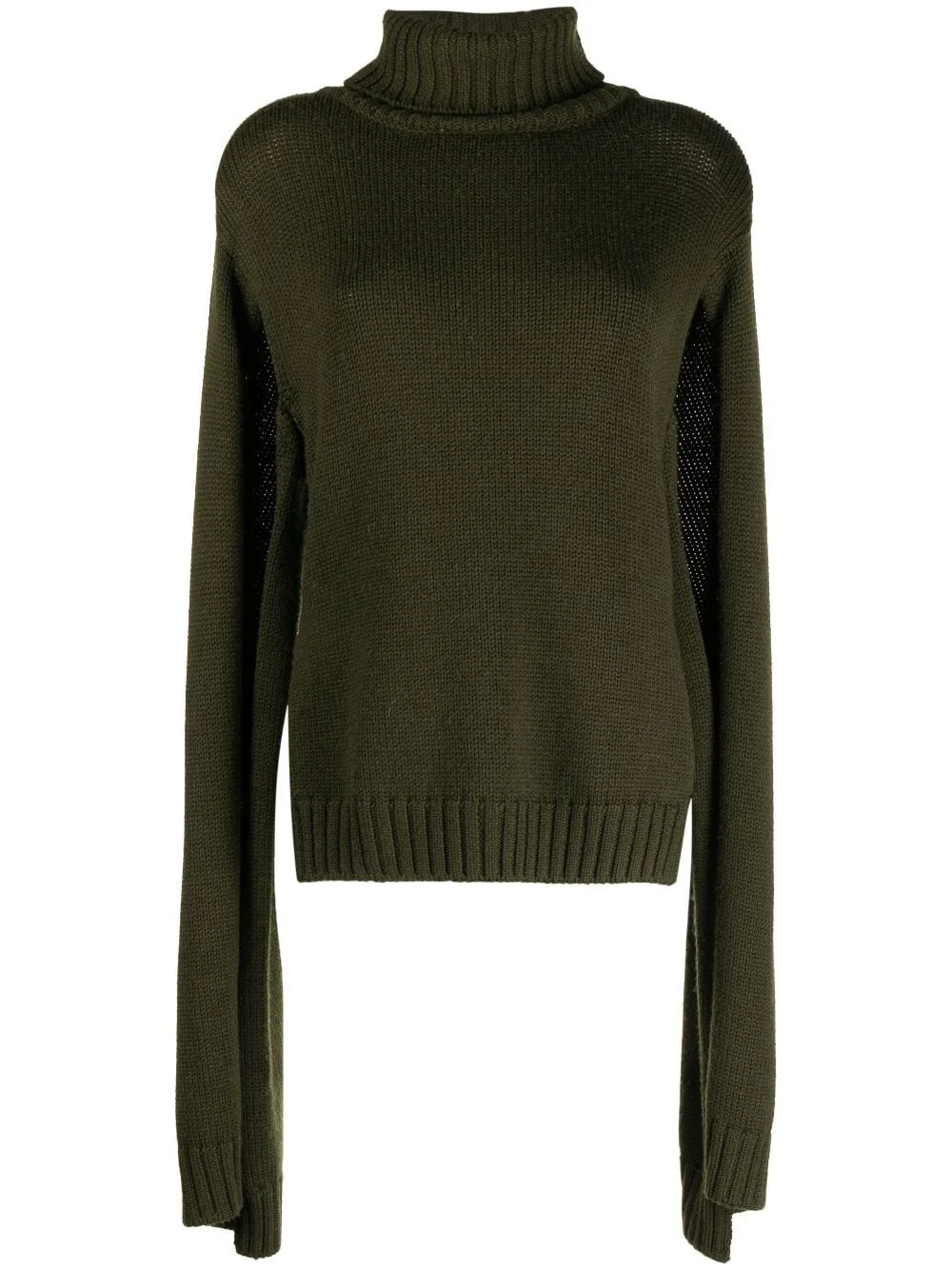 slit-sleeves knitted turtleneck sweater Highlights - Khaki - Cotton - Knitted construction - High neck - Long slit sleeves - Ribbed cuffs and hem - Straight hem Imported Composition Cotton 100% SIZE & FIT Model measurements Height 5 ft 10 in(1.77 m) Bust/Chest 31.49 in(80 cm) Hips 35.43 in(90 cm) Waist 25.19 in(64 cm) FittingInformation Designed to be unstructured, offering a loose fit throughout Washing instructions Dry Clean Only