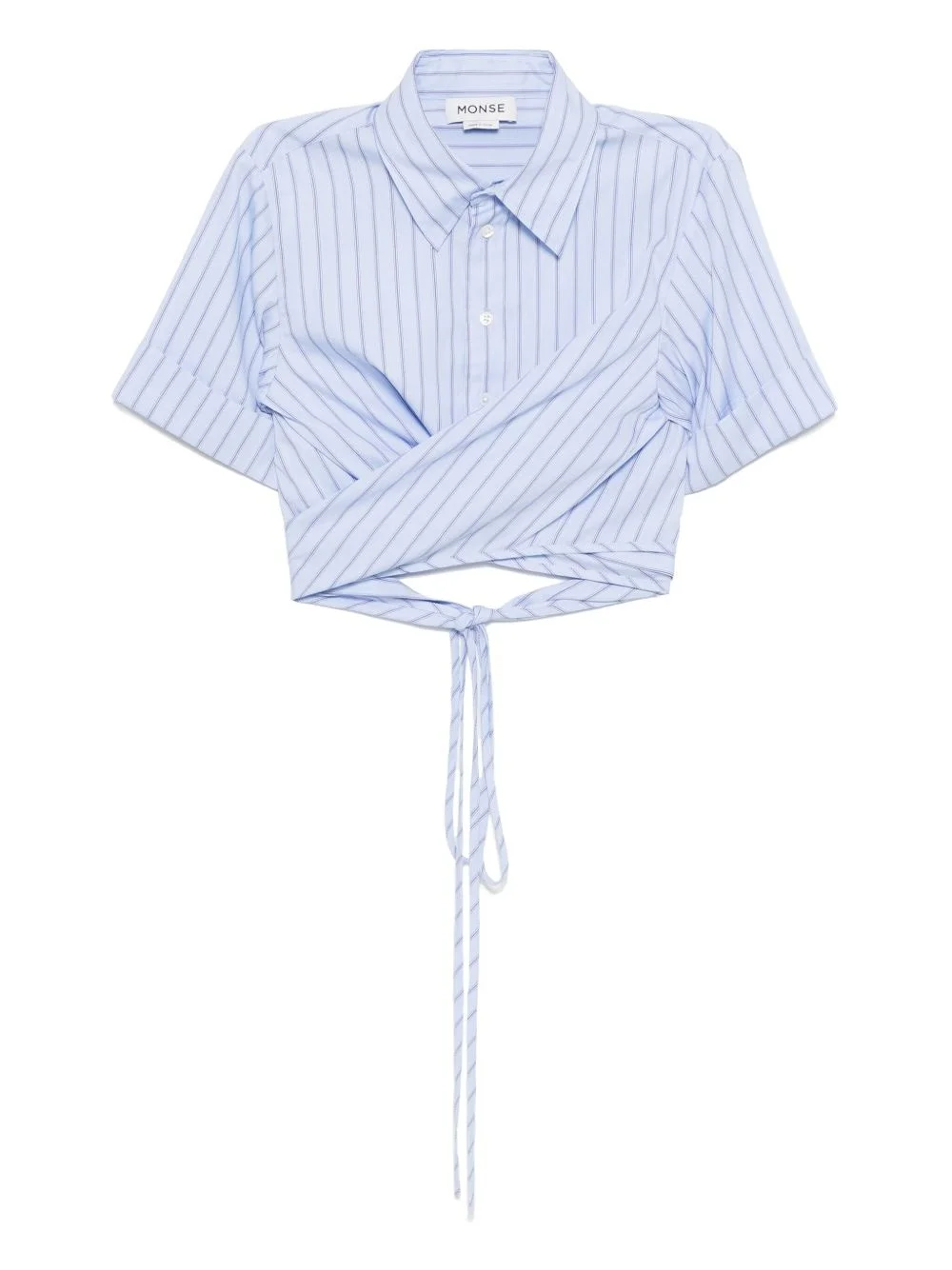 wrap cropped shirt Highlights - Light blue - Front button fastening - Rear tie fastening - Short sleeves - Vertical stripe print Imported Composition Cotton 100% SIZE & FIT Model measurements Height 5 ft 9 in(1.76 m) Bust/Chest 31.1 in(79 cm) Hips 35.03 in(89 cm) Waist 24.4 in(62 cm) FittingInformation Designed for a slim fit that sits just away from the body offering a close yet comfortable fit Cropped in length Made from a midweight non-stretch fabric