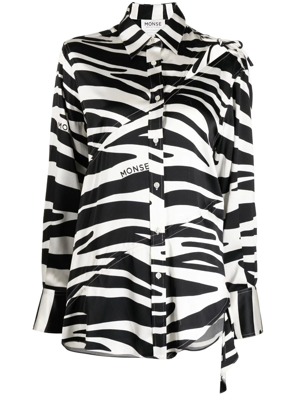 zebra-print slashed-detail silk shirt Highlights - Jet black/optical white - Silk - All-over logo print - Zebra print - Panelled design - Self-tie fastening - Front button fastening - Long sleeves - Buttoned-cuff sleeves - Curved hem Imported Composition Silk 100% SIZE & FIT Model measurements Height 5 ft 10 in(1.77 m) Bust/Chest 31.49 in(80 cm) Hips 35.43 in(90 cm) Waist 25.19 in(64 cm) FittingInformation Designed to be unstructured, offering a loose fit throughout