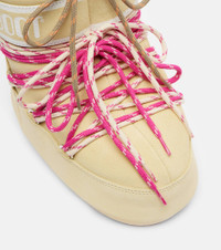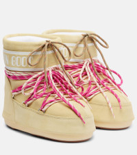 The Icon range from Moon Boot is inspired by astronaut gear, imitated with suction pads and padded collars. This pair is made from light yellow suede with contrasting pink-hued laces and the signature branding across the tops. Product Details - Upper: leather (suede) - Lining: fabric - Sole: fabric insole, rubber sole - Toe shape: round toe - Made in Romania - Includes: shoe box, dust bag - Designer color name: Light Yellow - Item color: yellow - Closure: lace-up - Item number: P01111217 Size & Fit - True to size - US sizes - 2cm-1" platform (size EU 38) - 4cm-1.5" wedge heel (size EU 38)