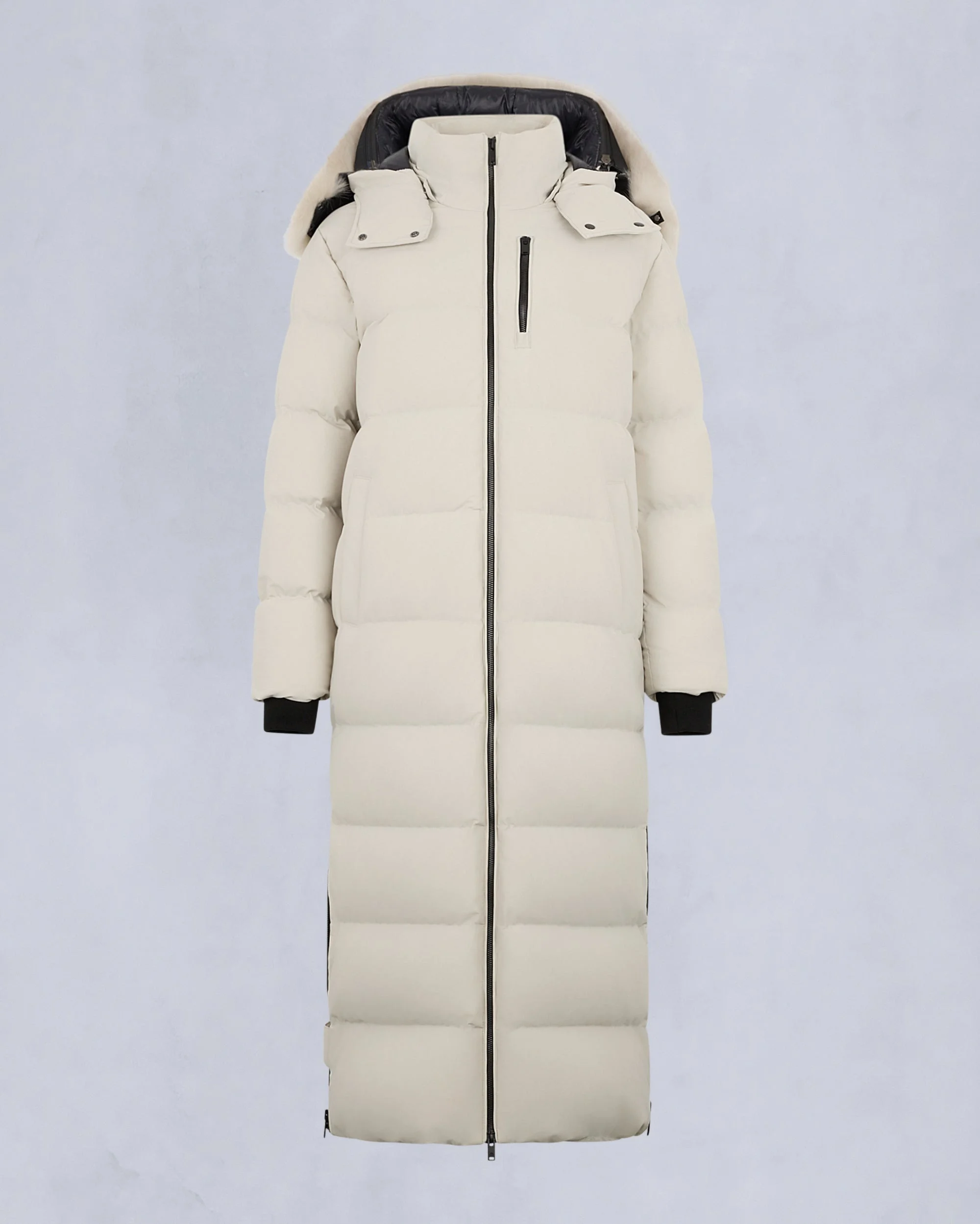 Refinement meets comfort with the Chelia Parka. With an easy, relaxed fit and super-warm 90/10 down and a water-repellent, wind-resistant shell, it offers full coverage with more than a touch of glamour. A removable two-way hood with detachable shearling trim adds versatility while rib knit storm cuffs and side-seam zip opening levels up utility and breathability. Size & Fit - Relaxed Fit : An easy and comfortable silhouette, cut with extra room on the body to allow for freedom of movement. It provides added shape, and it is comfortable. - 50"-127cm Center Back Length. Measurement is done based on a Small. Product Features Warmth & Protection - Protection Rating - Level 3: Crazy Cold – Heavy and durable, choose these garments when the cold gets serious. - Genuine Sheep Shearling - Engineered in Canada, GRS-Certified, RDS-Certified, Water Repellent, Wind resistant Design & Function - Removable Hood with Removable Shearling Trim - Down Filled Collar - 2-Way Zipper - 2 Zip Pockets - Logo Patch SKU: 822185871745 Materials & Care Fill Responsible Down Standard Certified 90% Duck Down, 10% Feathers Composition - Body: 76% Nylon, 24% Elastane - Lining: 100% Recycled Nylon Care Remove Detachable Trims Before Cleaning The Garment. Dry Clean Inside Out - Mild Process. Ironing Maximum Temperature 110°C - Without Steam. Country of Origin Made in Vietnam