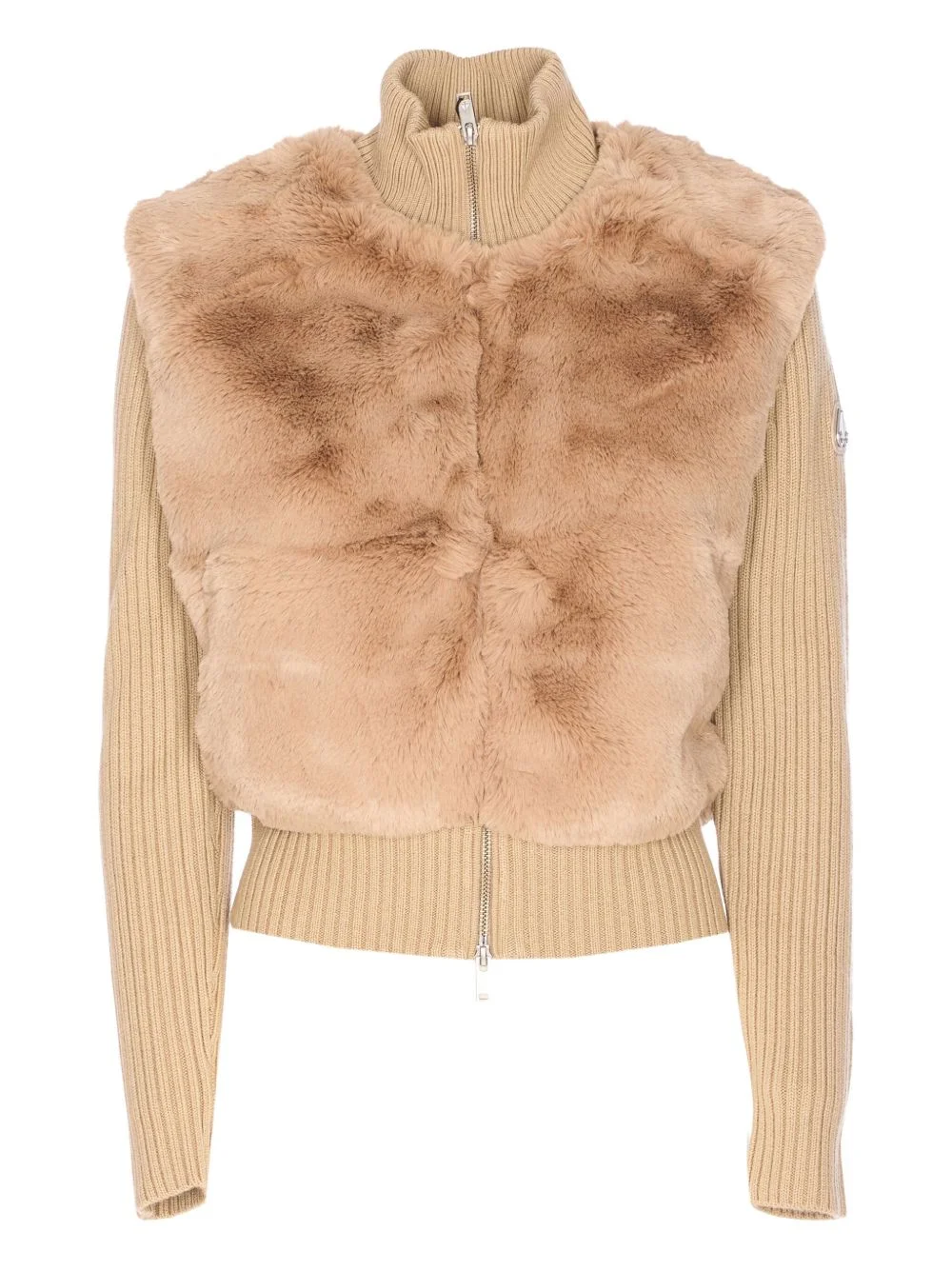faux-fur ribbed-knit jacket Highlights - Beige - Faux fur - Zip fastening - High neck - Ribbed knit sleeves - Logo patch Imported Composition Artificial Fur 100%, Polyester 100% Washing instructions Read Manufacturer Guidelines