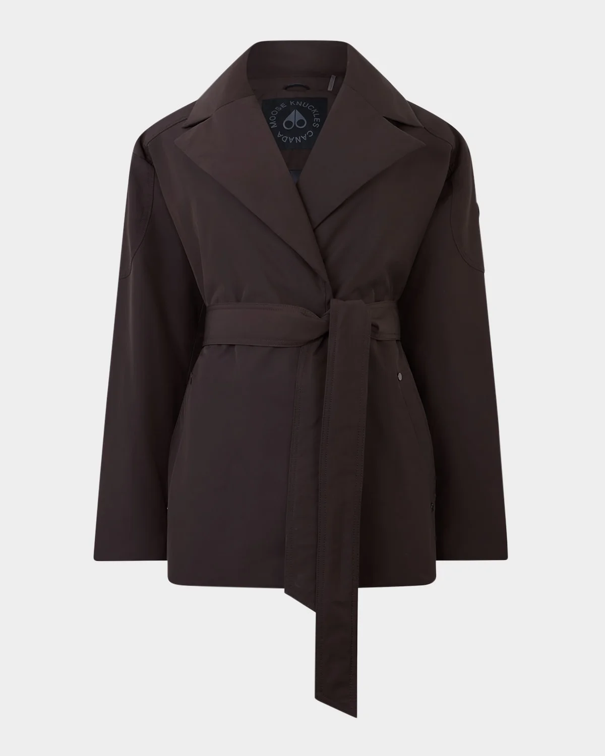 Featuring a timeless silhouette, the "Lonsdale" wrap jacket by Moose Knuckles is insulated with premium down and boasts a selftie belt for a personalized fit. Coldweather protection down to 32°F. Water and windresistant Notch lapels Long sleeves Signature metal logo plaque on the left sleeve. Side welt pockets Relaxed fit Hem falls to the hip Concealed snapfront Polyester Fill: Down/feather Lining: Nylon Machine wash cold Imported