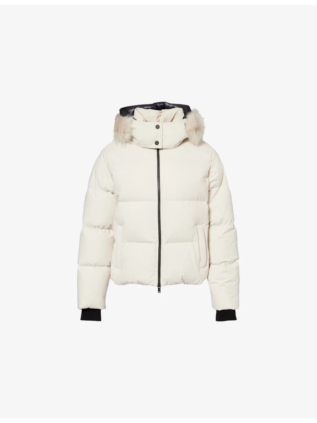 PRODUCT DETAILS - Moose Knuckles padded puffer jacket - 76% polyamide, 24% elastane - Zip fastening at front - Regular fit, funnel neck, detachable hood, fur trim at hood, long sleeves, logo plaque at sleeve, welt pockets at front, all-over padding - Machine wash at 30°C - True to size - Size small: length 24in / 61cm - Model is 5ft 10in/1.78m and wears a size small - Midweight, slight stretch Ref: R04577926