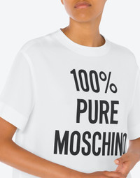 Envers satin T-shirt with 100% Pure Moschino slogan print on the front and zip on the back. - Relaxed fit - Contrasting print - Short sleeves - Partial fastening on the back with gold-electroplated zip Fabric:70% Cellulose acetate, 30% Viscose Code: AEF241E 021505331001 FIT - Relaxed fit - Model bust size : 82 - Model height : 1.78 cm - Model Hips : 88 cm - Model size : 40 - Model waist : 60 cm