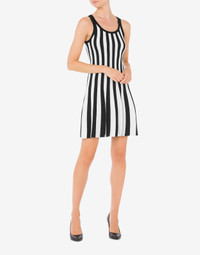 Stretch viscose short dress with black and white striped archive inlay. - Slim fit - Black and white stripes - Crew neck - Sleeveless - Flared hem Fabric:12% Polyester, 88% Viscose Code: AEF241E 049405031555 FIT - Slim fit - Model bust size : 82 - Model height : 1.78 cm - Model Hips : 88 cm - Model size : 40 - Model waist : 60 cm