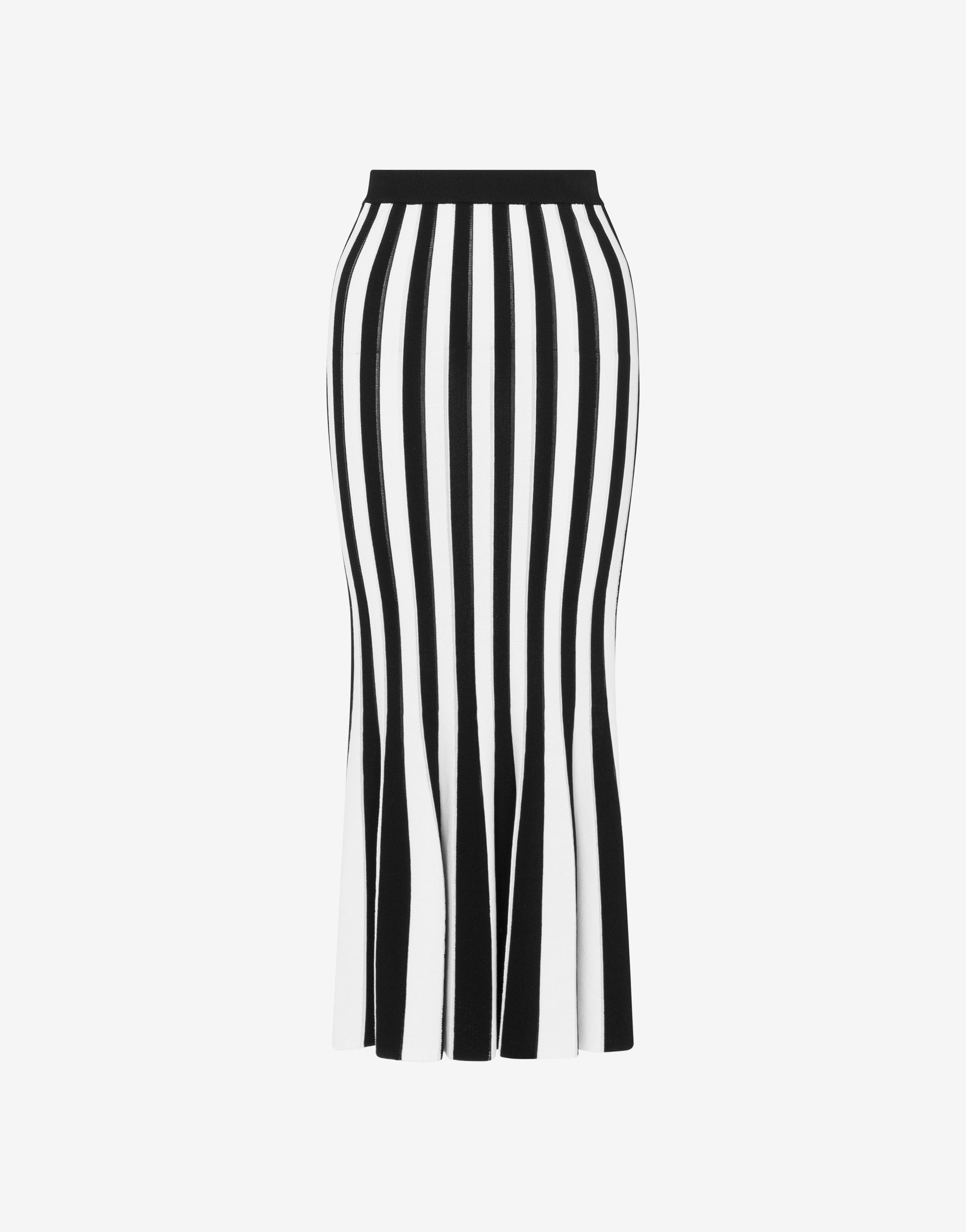 Stretch viscose midi skirt with black and white striped inlay and slightly flared hem. - Slim fit - Vertical stripes - High waist - Elasticated waist Fabric:12% Polyester, 88% Viscose Code: AEF241E 018305031555 FIT - Slim fit - Model bust size : 82 - Model height : 1.78 cm - Model Hips : 88 cm - Model size : 40 - Model waist : 60 cm
