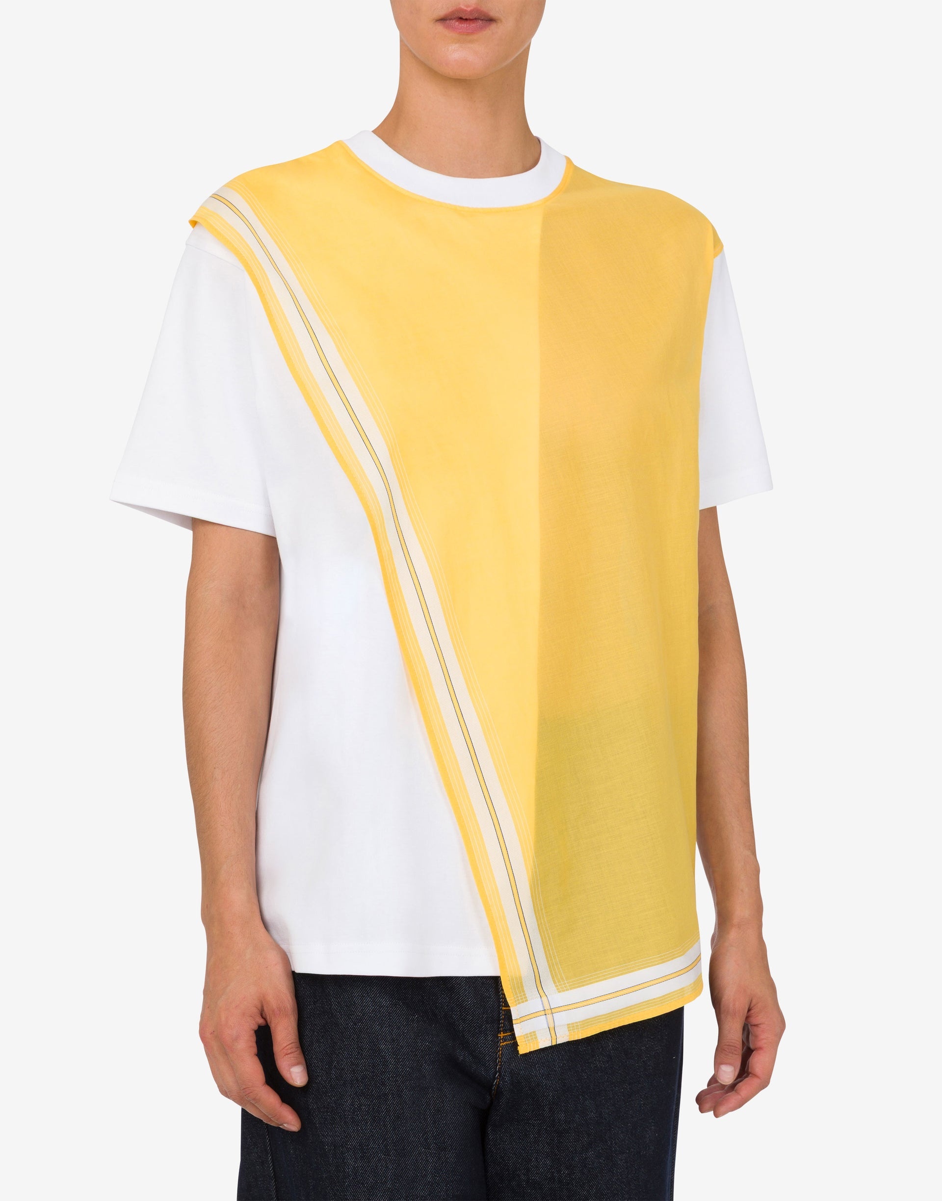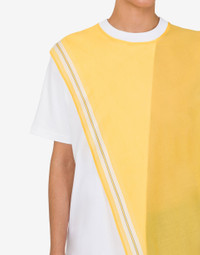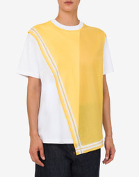 COTTON INTERLOCK T-SHIRT WITH JACQUARD PANEL ON COTTON POPLIN IN HANDKERCHIEF DESIGN. PRODUCT DETAILS REGULAR FIT - JACQUARD EMBROIDERY - SHORT SLEEVES - ASYMMETRIC HEM FABRIC: 100% COTTON SKU: AEF251E A070505423001 FITTING & DIMENSIONS - MODEL HEIGHT: 180 CM - MODEL BUST: 80 CM - MODEL WAIST: 60 CM - MODEL HIPS: 89 CM - MODEL SIZE: 40