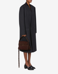 NUBUCK SHOULDER BAG, WITH A DELIBERATELY SOFT AND UNLINED CONSTRUCTION, MAKING IT SURPRISINGLY LIGHT. A DISTINCTIVE FEATURE IS THE FULLY DETACHABLE DECORATIVE BELT THAT WRAPS AROUND THE BAG'S BODY. THE ADJUSTABLE SHOULDER STRAP ALLOWS FOR MULTIPLE CARRYING OPTIONS. LOGO ON THE FLAP ADJUSTABLE STRAP WITH MUSHROOM DECORATIVE BELT WITH METAL BUCKLE MAGNETIC CLOSURE TWO INTERNAL COMPARTMENTS BACK COMPARTMENT WITH ZIP POCKET AND SMALL APPLIED POCKET FABRIC: 100% CALFSKIN CODE: AEF2422 758180350101 FIT DEPTH: 15 CM HEIGHT: 19 CM WIDTH: 26.5 CM