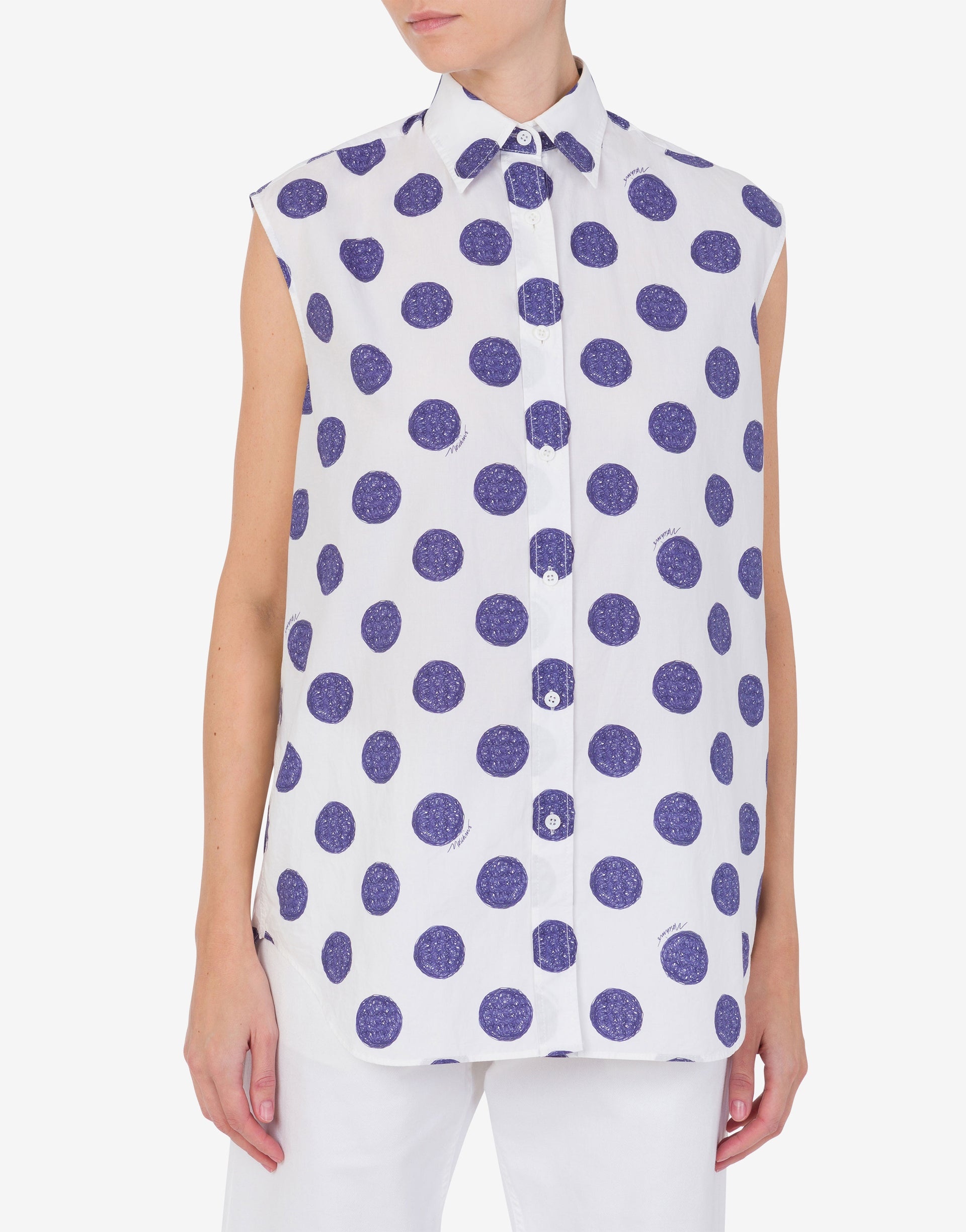 SHIRT TOP IN COTTON POPLIN WITH A PEN-DRAWN POLKA DOT EFFECT PRINT. PRODUCT DETAILS REGULAR FIT - ALL-OVER PRINT - SHIRT COLLAR - SLEEVELESS - FRONT BUTTON CLOSURE FABRIC: 94% COTTON, 6% ELASTAN SKU: AEF251D A022904501002 FITTING & DIMENSIONS - MODEL HEIGHT: 180 CM - MODEL BUST: 80 CM - MODEL WAIST: 60 CM - MODEL HIPS: 89 CM - MODEL SIZE: 40